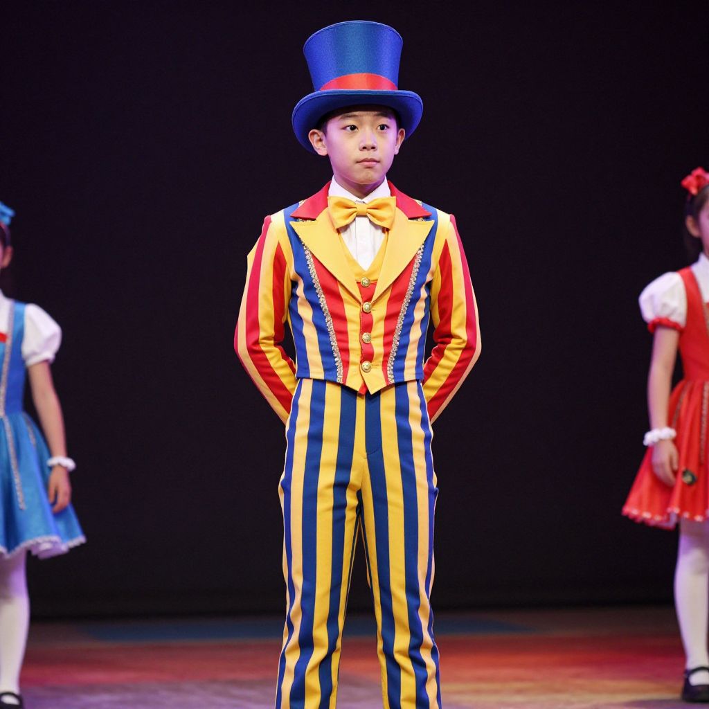Circus ringmaster costume, solo, hat, striped clothes, vertical-striped clothes, top hat, striped pants, standing, male focus, 1boy, pants, arms behind back, vertical-striped pants, 1girl