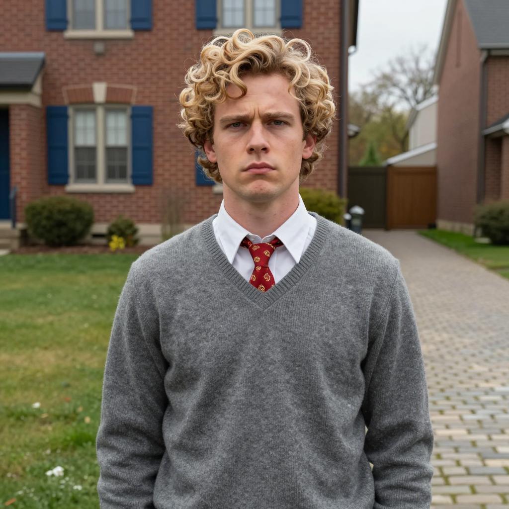 Portrait of a young Caucasian man with curly blond hair standing outdoors in a suburban neighborhood. He has a serious expression and is dressed in a gray V-neck sweater over a white shirt with a red tie featuring a gold pattern. Behind him is a brick house with blue-trimmed windows, a lush green lawn, and a cobblestone path leading away. The image is captured in realistic lighting during the daytime with clear sky.