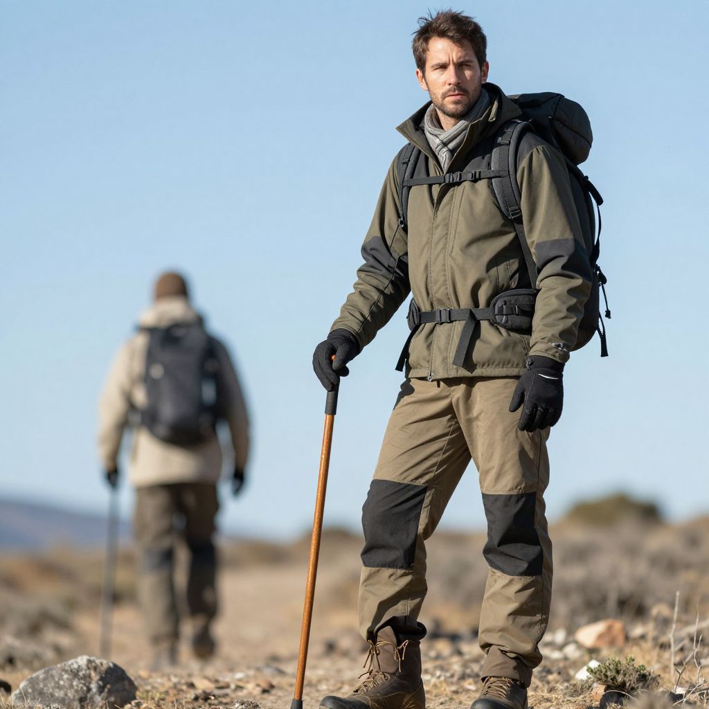 Photograph of a rugged, bearded man standing in a rocky, barren landscape under a clear blue sky. He is wearing a dark green, insulated outdoor jacket with black accents, matching pants, black gloves, and brown hiking boots. He carries a large black backpack with a rolled-up sleeping bag on top and holds a wooden walking stick in his right hand. His expression is determined. In the blurred background, another person is visible, dressed in similar outdoor gear and walking away, also holding a walking stick. The terrain is rocky and sparse with distant mountains.