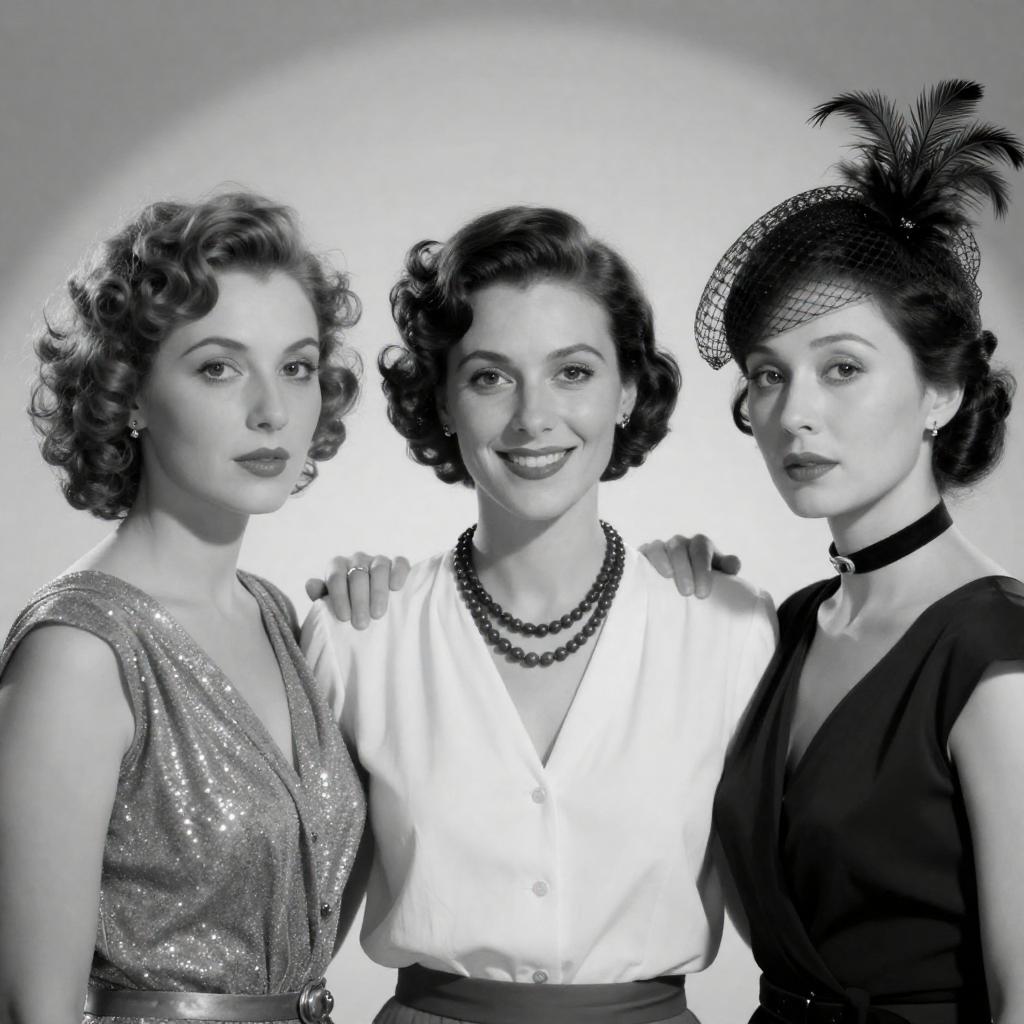 Black-and-white photograph of three women in elegant 1930s attire. Left woman with curly hair, sparkling dress, neutral expression. Middle woman with short hair, white blouse, beaded necklace, smiling. Right woman with dark hair, feathered hat, black dress, choker, intense gaze. Background includes soft, curved light. Middle woman rests hand on left woman's shoulder.