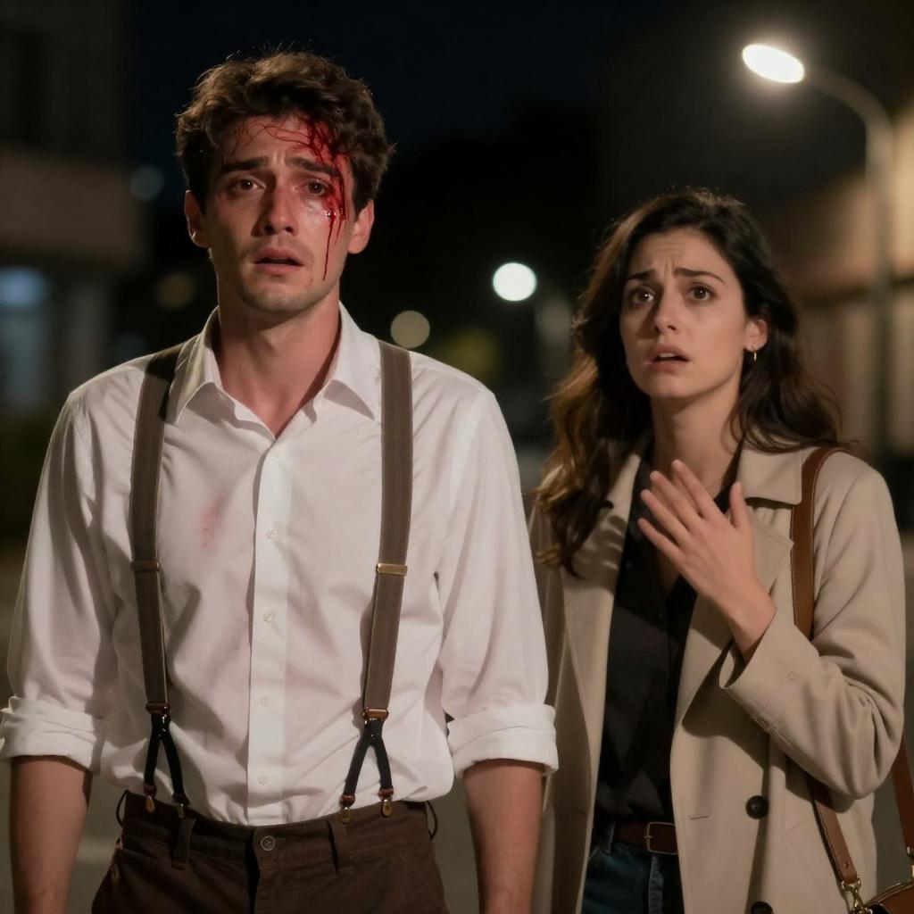 Photograph of a distressed man with blood on his white shirt and brown suspenders standing beside a concerned woman with brown hair and a beige coat, both illuminated by streetlights in a nighttime urban setting. The man's face is blood-stained, and the woman's hand is raised in surprise.