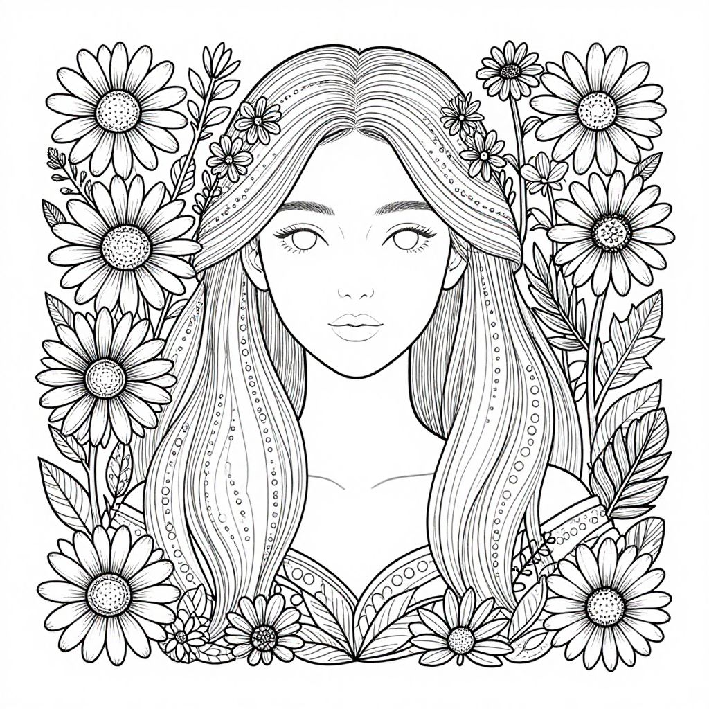 Elegant line art illustration featuring a woman with long hair adorned with delicate floral patterns and dotted accents, surrounded by vibrant daisy-like flowers and intricate foliage, designed as a Johanna Basford printable coloring page.