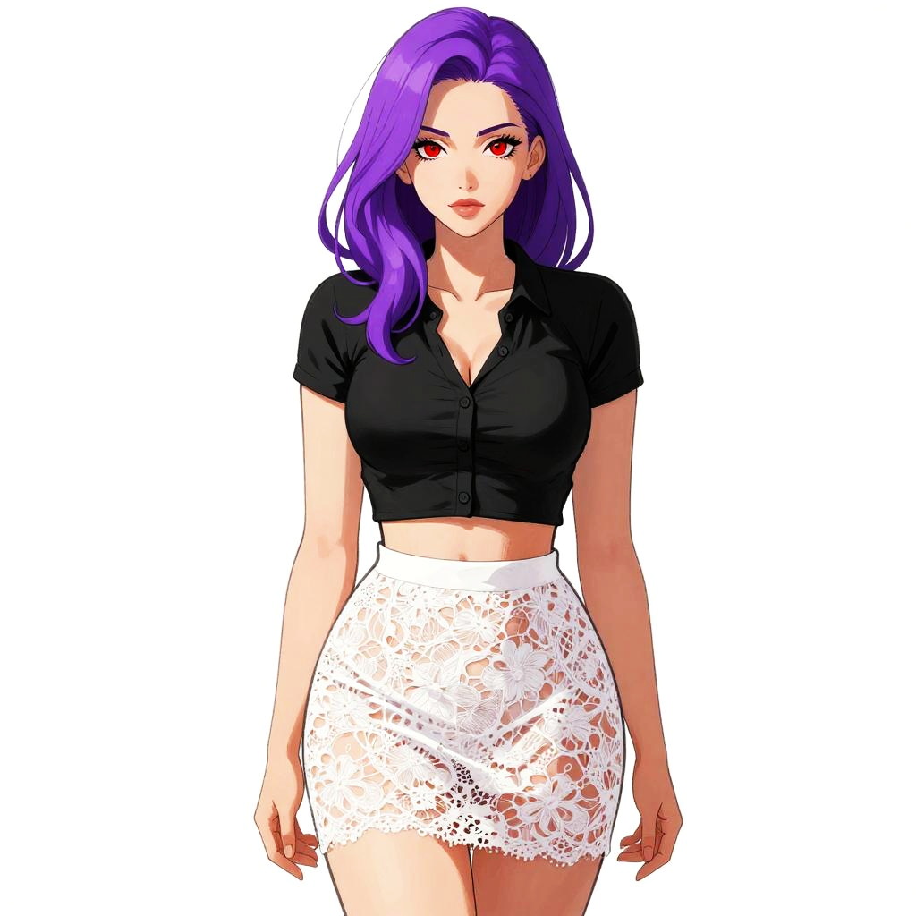 This digital artwork features a young woman with vibrant purple hair, styled in loose waves, and striking red eyes. She wears a fitted, short-sleeved black crop top that accentuates her medium-sized breasts, and a white lace mini-skirt that is semi-transparent, revealing her fair-skinned thighs. Her expression is neutral, with a slight hint of confidence. The background is pure white, making her the focal point. The style is reminiscent of modern manga or anime, with bold colors and clean lines, highlighting the character's features and clothing details.