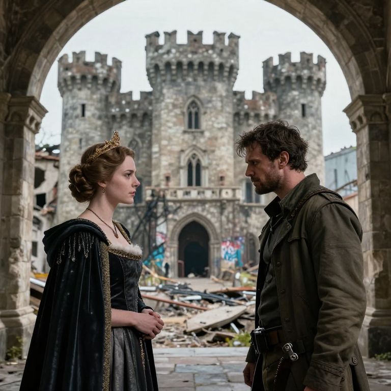 An imaginative concept photo where a castle's interior, with strict hierarchies and polished stone, is mirrored by an outside setting of a dismantled city with exposed wires and graffiti, and the queen and rebel are shown in conversation mid-frame—one calm and composed, the other aggressive and unfiltered, their faces showing conflicting emotions of power and unrest.