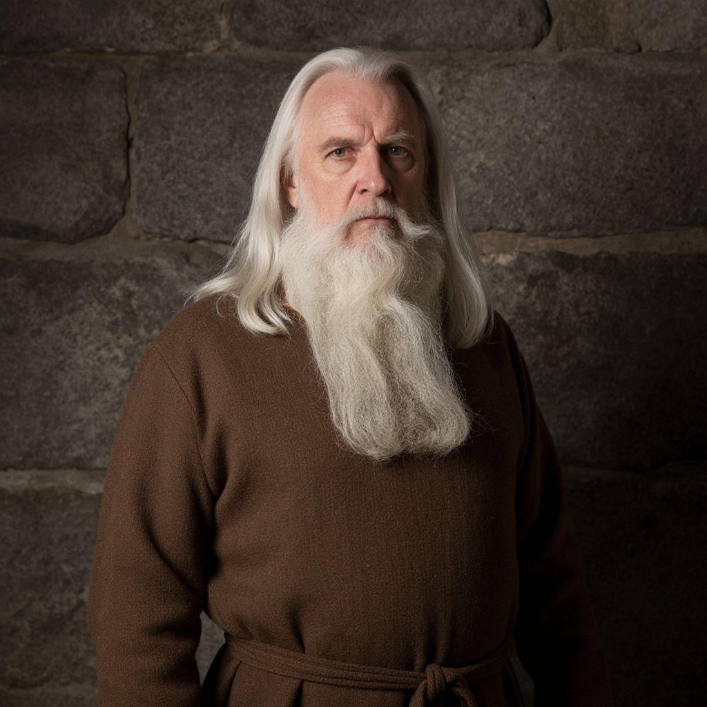 A photograph of an elderly white man with a long, white, flowing beard and long white hair. He's wearing a brown, long-sleeved tunic with a belt tied at the waist, standing against a rough, stone wall. His expression is serious, and the lighting highlights his facial features and beard. The overall vibe is medieval or historical.
