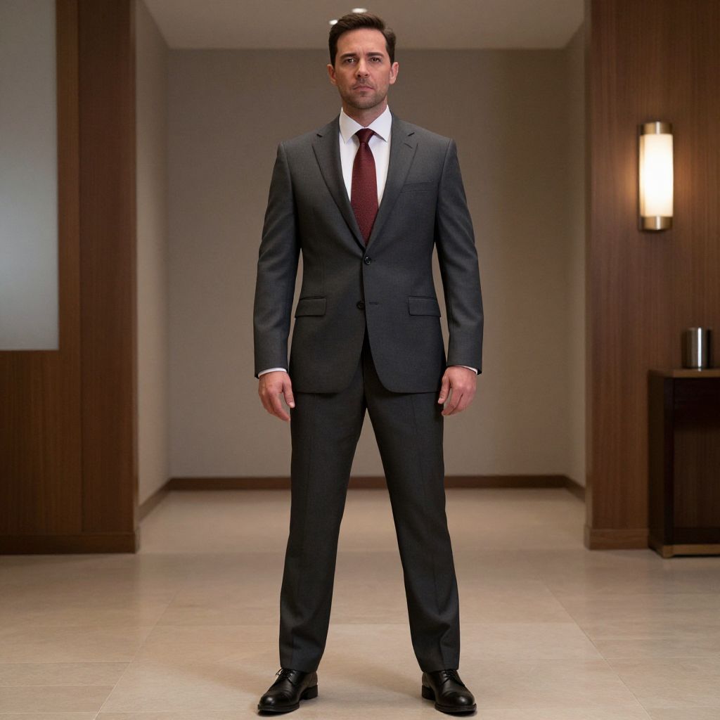 Photograph of a handsome man in a dark navy suit, white shirt, and maroon tie, standing confidently in a modern, dimly lit hallway
