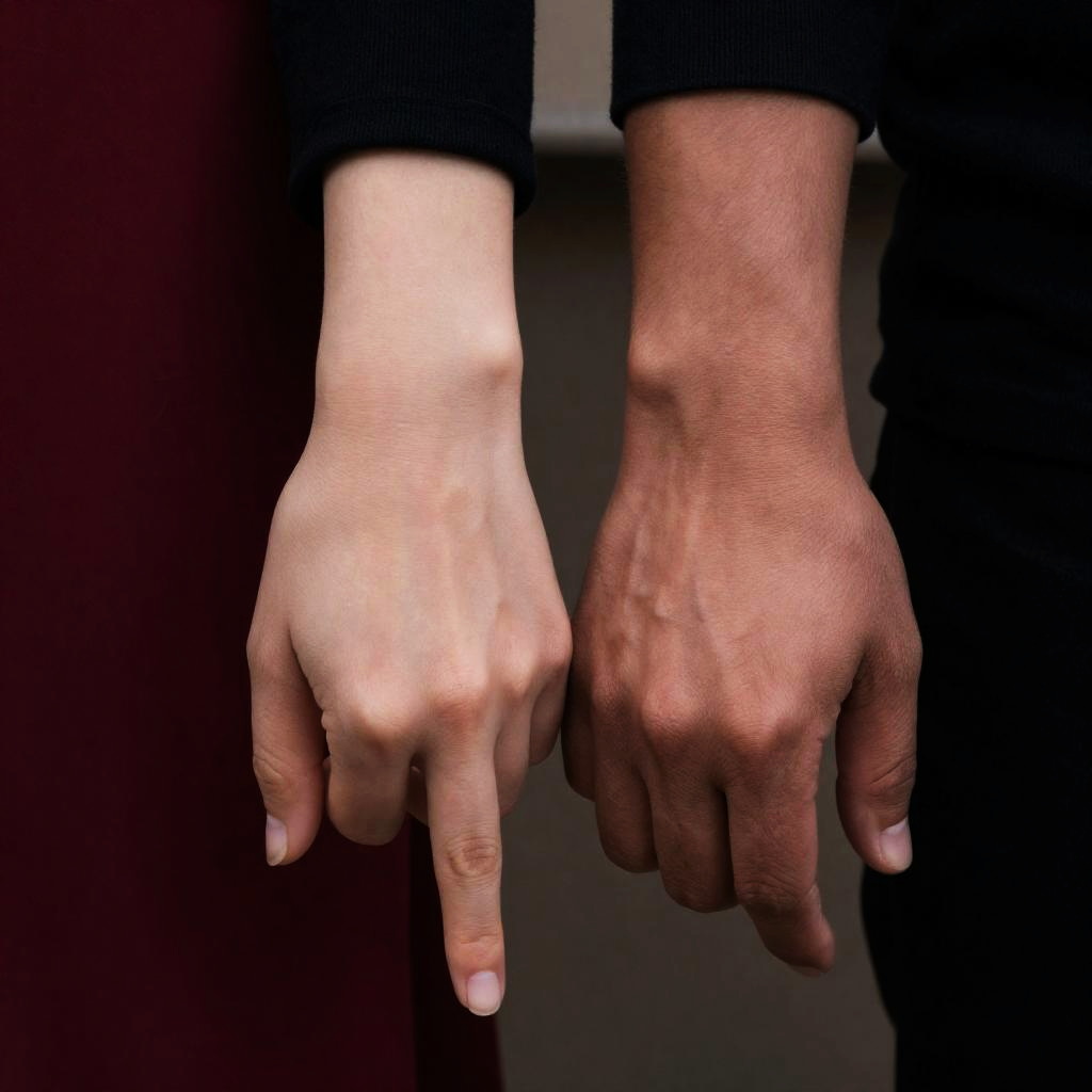 Close-up photograph of two hands side by side, featuring contrasting skin tones. The left hand has a lighter skin tone and is pointing downwards, while the right hand has a darker skin tone and is relaxed. Both subjects wear black long-sleeved clothing. Background includes a dark, shadowy area and dark red fabric.