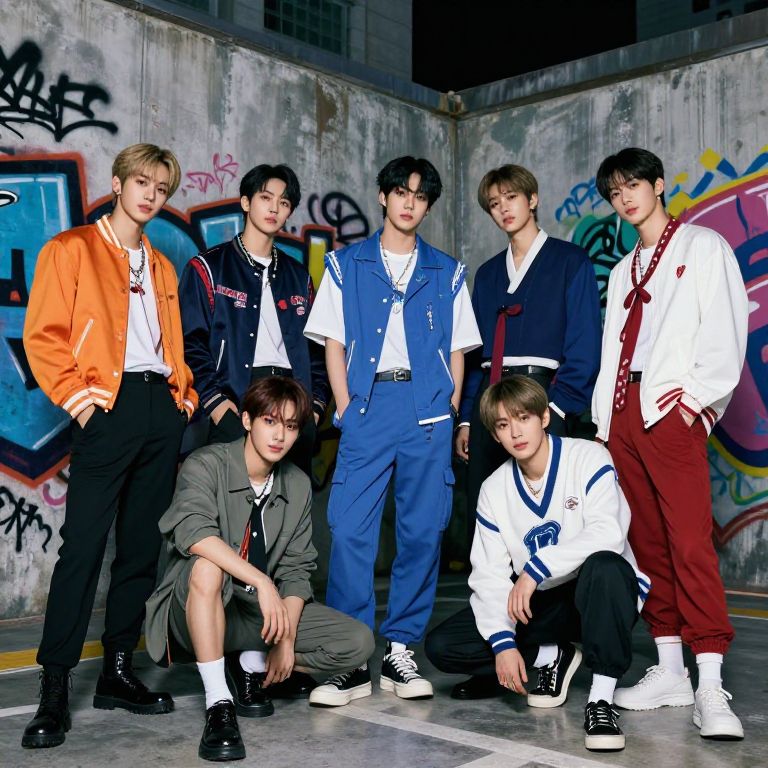 Kpop groups with 7 members boy in a high fashion photoshoot, sleek modern urban setting with graffiti walls, dramatic lighting emphasizing sharp features and synchronized poses, vibrant streetwear blending contemporary and traditional Korean elements