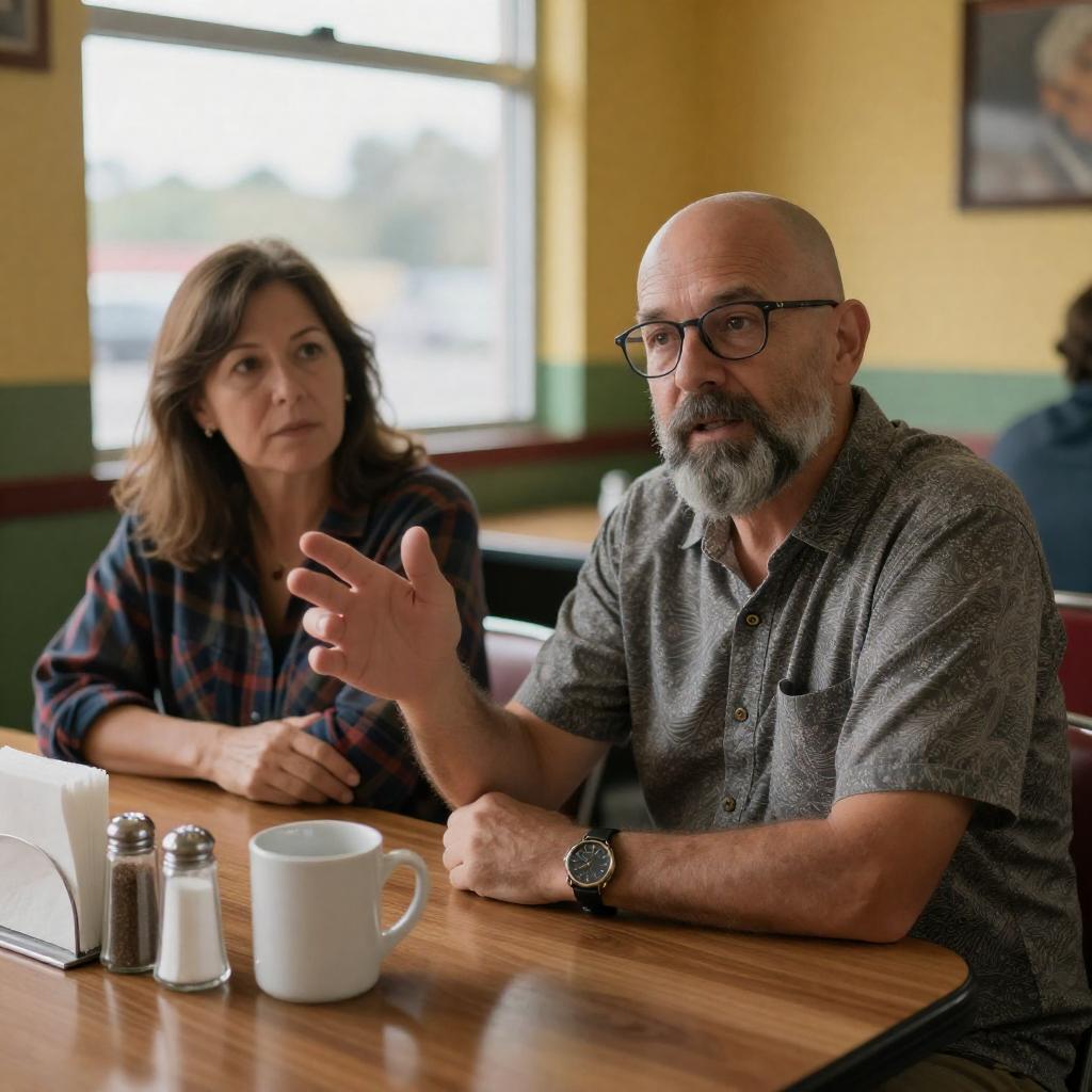 Photograph of two people in a diner. Bald man in black suit and glasses sits at counter, smiling. Woman with short gray hair, wearing checkered shirt and jeans, stands behind counter holding a coffee pot. Counter has cups, condiments, and jars. Background has posters, blinds, and a door. Warm lighting. Woman looks at man.