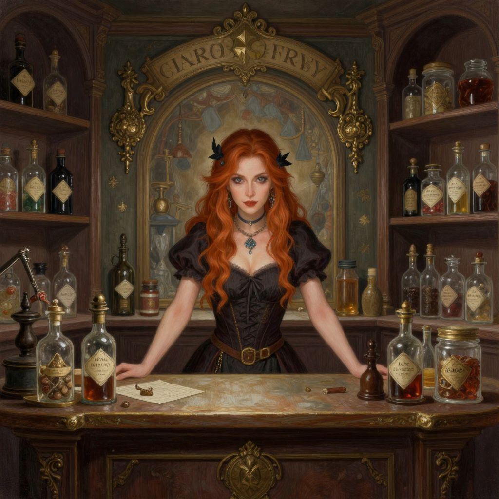 A mischievous-looking woman stands behind a counter in a magical alchemist's shop, surrounded by bottles and jars, with intricate details and soft lighting, in a Larry Elmore art style.