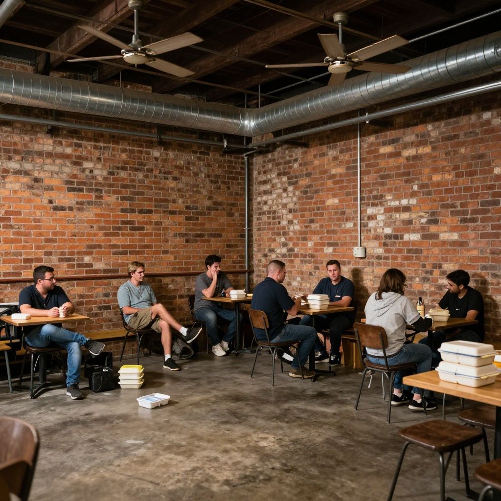 Rustic factory break room with exposed brick walls, metal piping, scattered lunchboxes, industrial fans on ceiling, casual workers resting and talking, warm tones, realistic industrial environment