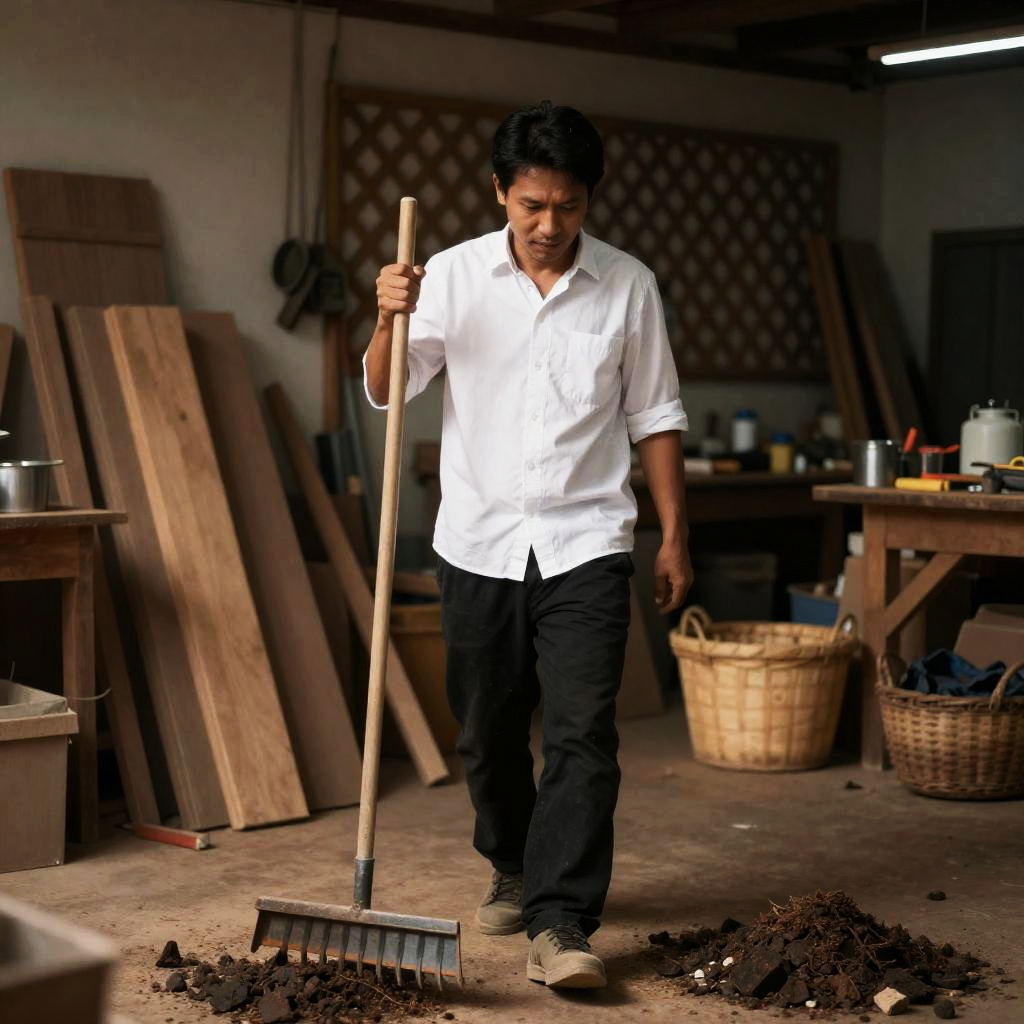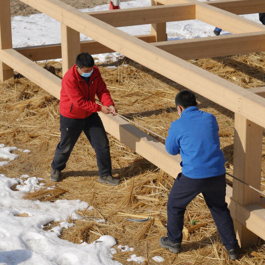 Two men pulling on ropes attached to a large wooden structure on a straw-covered ground. Snow patches surround them. One man wears a red shirt, the other a blue shirt. Wooden frame structure in background. Sunlight casting shadows. Both men focused on task. One man standing to the left, other to the right.