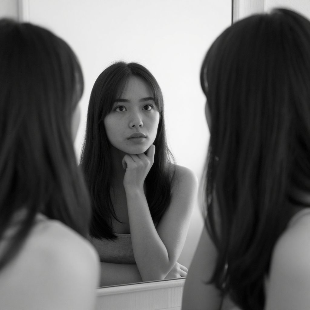 Reflections intertwine as a woman gazes into a mirror, her mirrored self capturing the quiet contemplation of her soul in a monochromatic world.