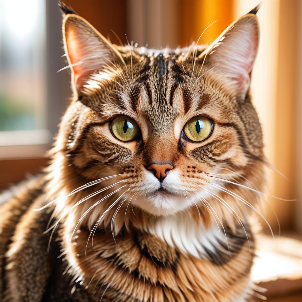A detailed close-up portrait of a domestic tabby cat with expressive greenish-yellow eyes and well-defined fur texture. The cat is positioned near a window, illuminated by natural warm light, creating a soft background blur and enhancing the warm color tone. Indoor setting with realistic and photographic texture highlighting the cat's features.