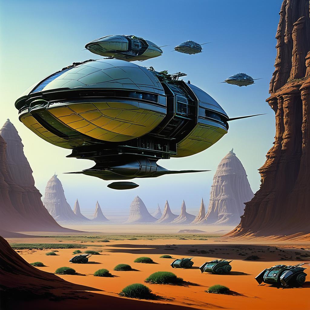 A sleek, metallic futuristic spaceship flying above a reddish desert landscape with sparse green vegetation. In the background, several large, futuristic, dome-shaped structures rise from the desert floor, framed by natural rock formations. The scene depicts a sci-fi environment with advanced technology and alien architecture under a clear sky.