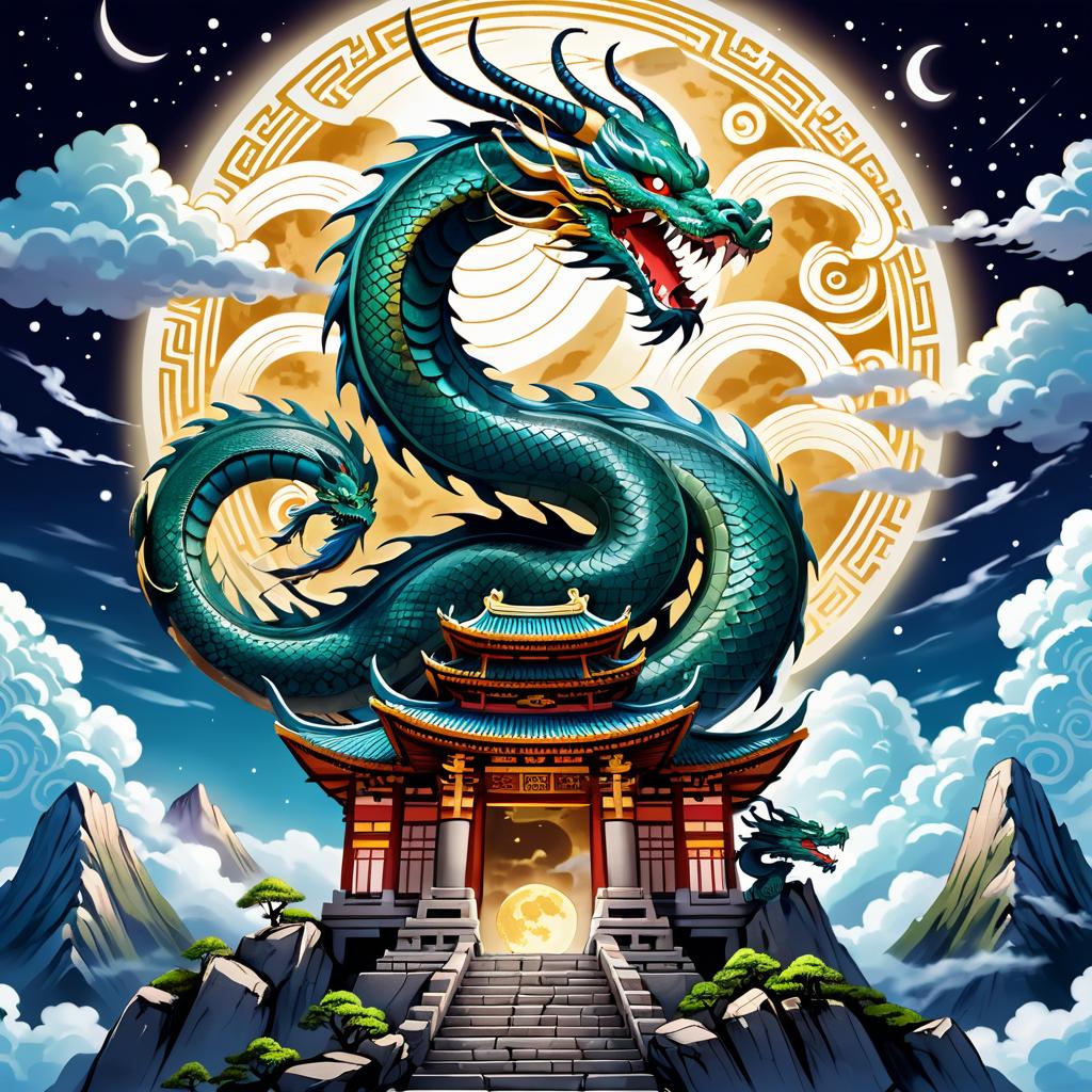 Bakunawa Serpent Dragon with Moon and Mountain Shrine