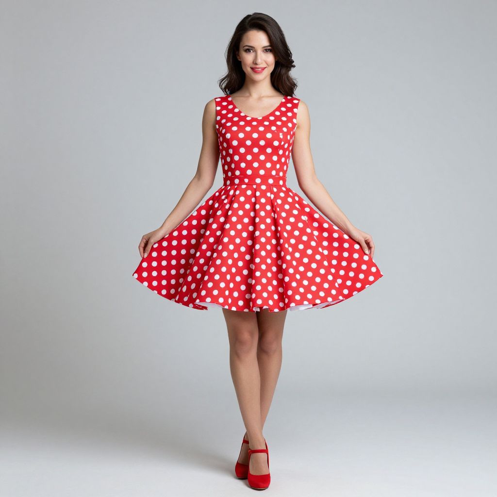 Red Polka Dot Dress Costume, woman in a red polka dot dress and red shoes
