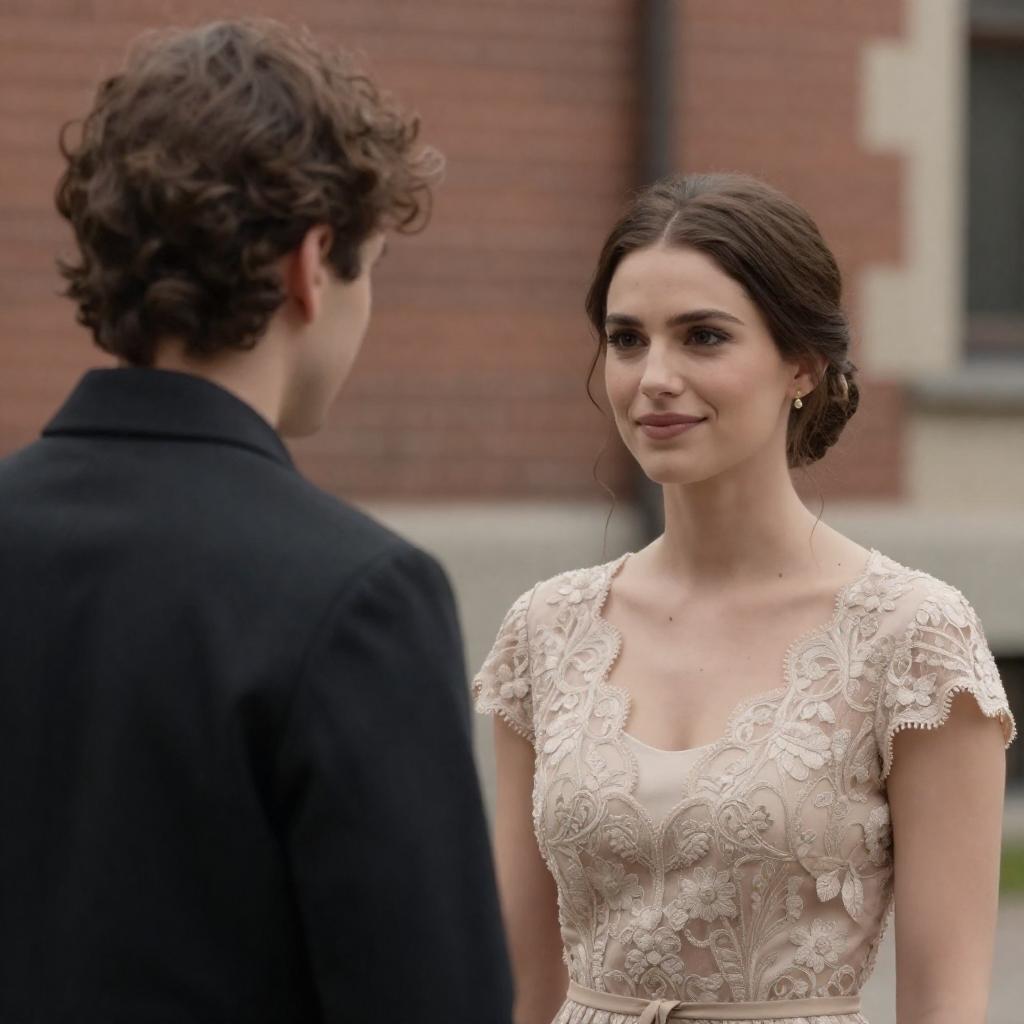 Photorealistic image of a young Caucasian woman and man standing in a dressing room. The woman is wearing a sleeveless, deep V-neck, blush pink silk gown with intricate gold embellishments, her hair styled in an elegant updo with earrings. The man has curly dark hair and is dressed in a mauve velvet suit with a white dress shirt underneath. They are facing each other, with various pastel-toned and brown dresses hanging on golden garment racks in the background. The setting has cinematic lighting and intricate fashion details.