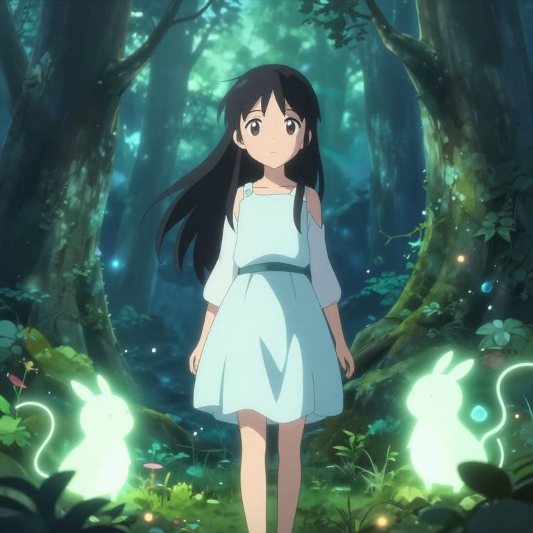 Anime-style digital drawing of a young girl with long black hair, wearing a white off-shoulder dress, walking through a mystical forest with glowing white