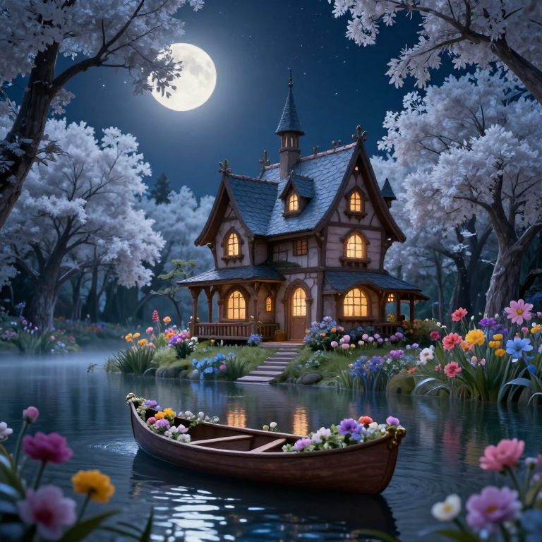 The image depicts a enchanting, fairy-tale-like house nestled in a magical forest by the lake, bathed in the soft glow of a full moon. The house, with its quaint, gothic-style architecture and charmingly lit windows, stands as a centerpiece in this dreamy landscape. Surrounding the house are lush, vibrant flowers and trees, their pearlescent hues adding to the ethereal atmosphere. A canoe, adorned with beautiful flowers, floats gently on the lake, its presence enhancing the idyllic setting. The night sky is dotted with stars, creating a serene and tranquil ambiance. The overall composition, with its harmonious blend of natural and man-made elements, evokes a sense of wonder and enchantment, transporting the viewer to a magical, fairy-tale world.