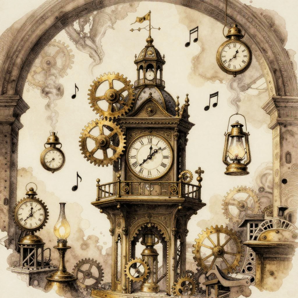 An artistic portrayal of an antique clockwork automaton bard, surrounded by brass gears, drifting musical notes of steam, pocket watches, and flickering oil lamps, in the interior of an abandoned Victorian clocktower, created in a steampunk ink and watercolor illustration with intricate linework and sepia washes, with melancholic yet whimsical ambiance
