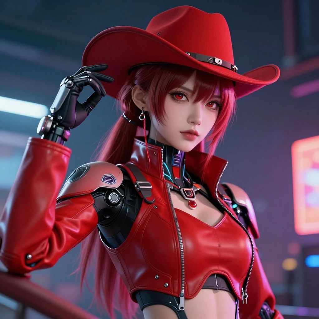 Photorealistic CGI image of a young woman with neon green hair and skin, wearing a bright yellow-green cowboy hat, matching crop top, and high-visibility jacket. She has black fingerless gloves, a black belt with buckles, and a green pendant necklace. Her eyes are striking green, and she has a confident, slightly mischievous expression. The background is a blurred, neon-lit urban setting with colorful lights. The textures are smooth and vibrant, emphasizing the futuristic, cyberpunk aesthetic.