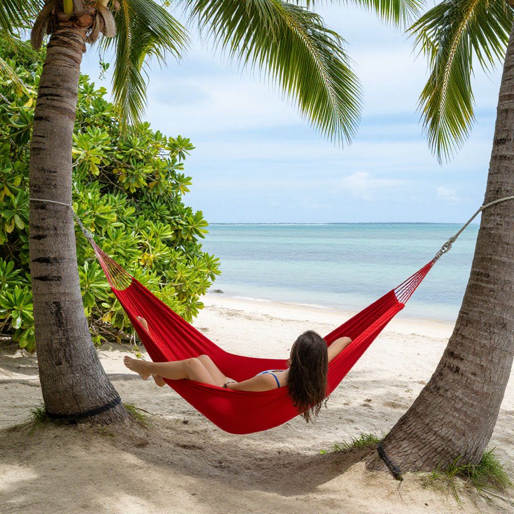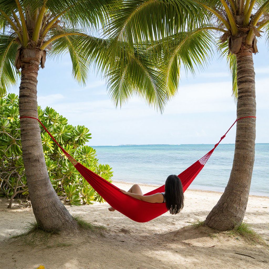Woman lounging in a vibrant red hammock suspended between two palm trees on a serene tropical beach, surrounded by lush greenery and overlooking calm turquoise waters under a clear sky.