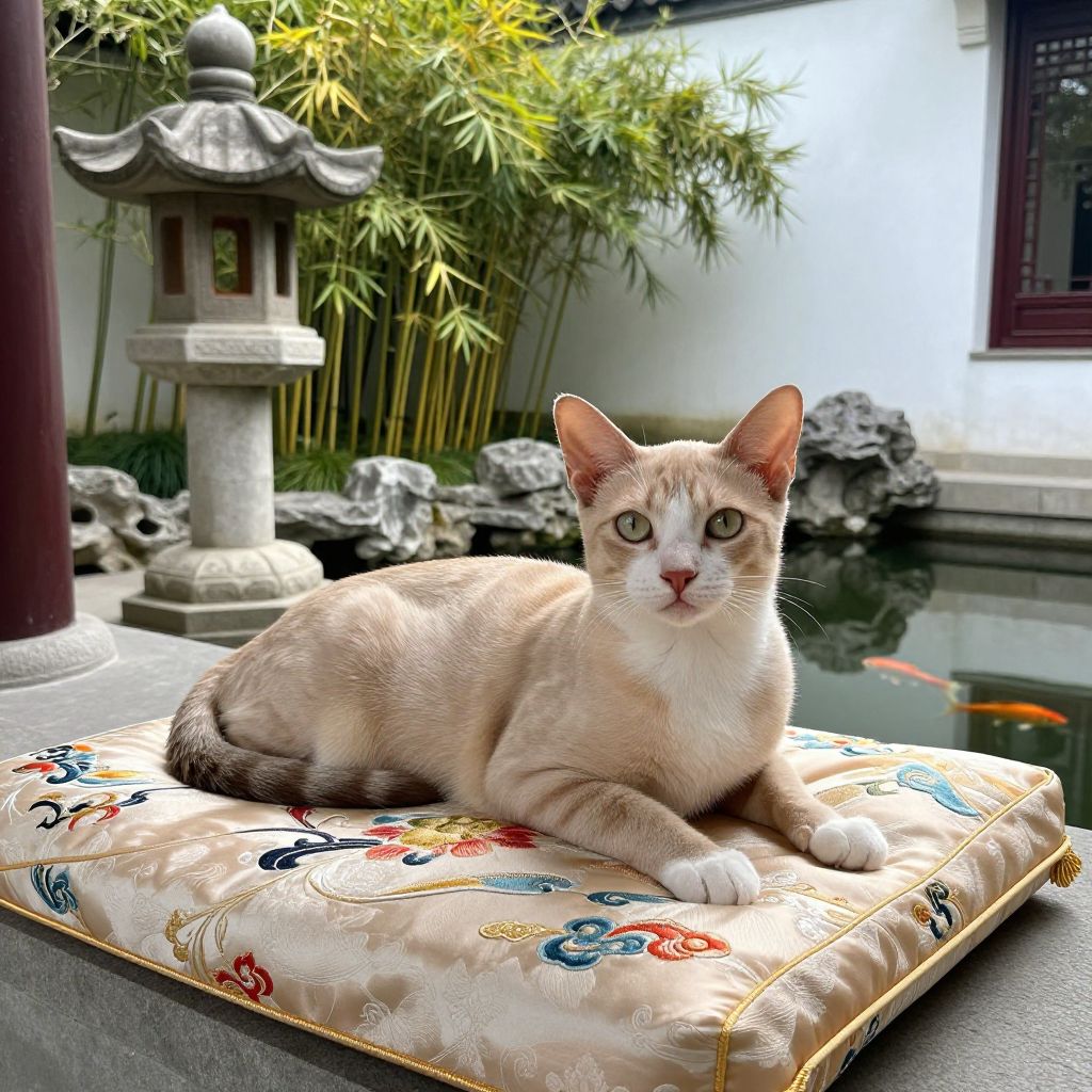 Photograph of a light-colored, white-patterned cat lounging on an ornate, floral-patterned cushion in a serene garden, with a traditional