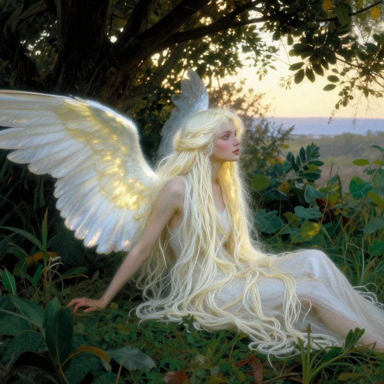 Digital artwork of a fair-skinned, long-blond-haired angel with glowing white wings, sitting amidst lush greenery at sunset.