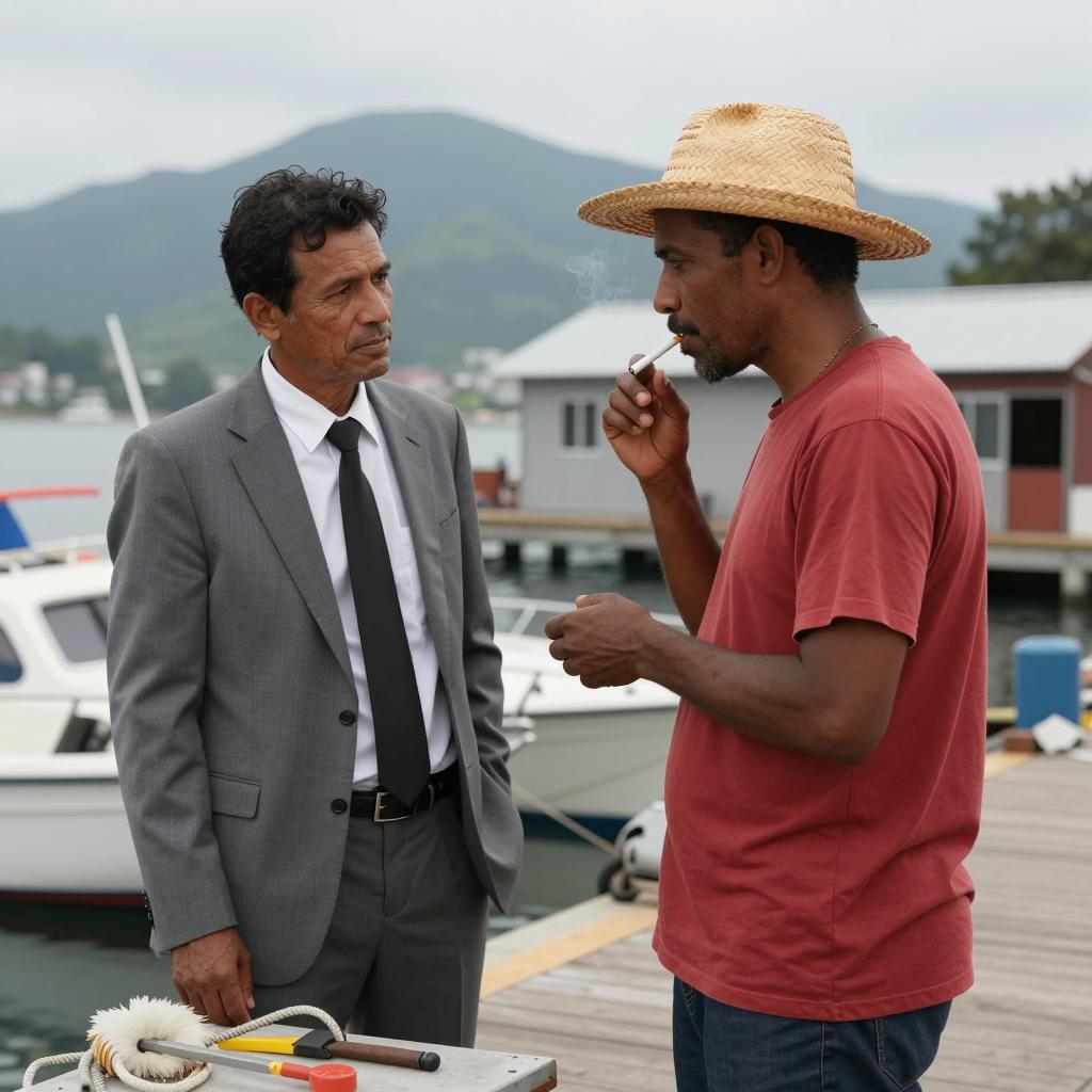 Two men sitting inside an old yellow bus looking out of the open window. The man on the left is wearing a red polo shirt and a straw hat, raising his arm. The man on the right has dark hair, dressed in a plaid shirt, leaning on the bus window frame. The side of the bus door is visible with partially readable text "PROGESED BY CORP." The background outside the bus is dark, and the interior of the bus can be seen faintly through the window reflection.