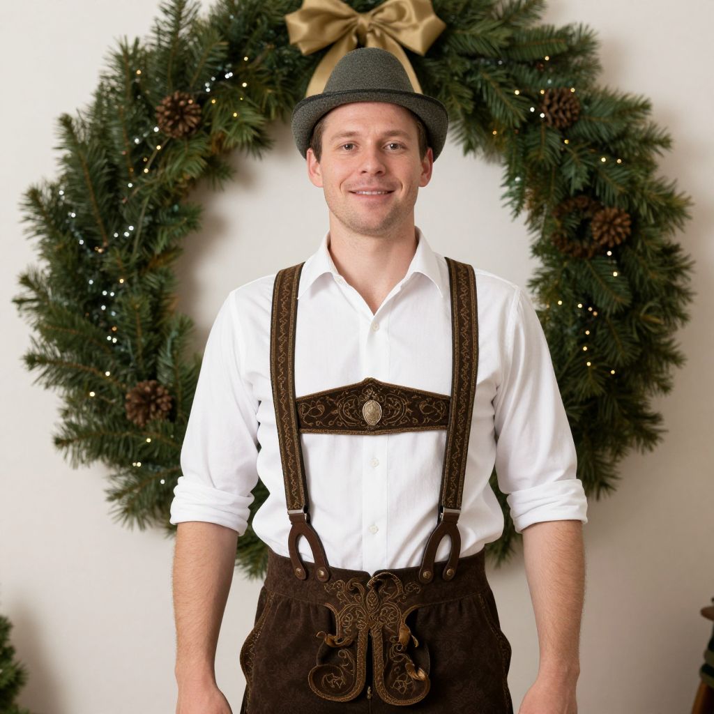 Bavarian Beer Costume, man in a hat and suspenders standing in front of a christmas wreath