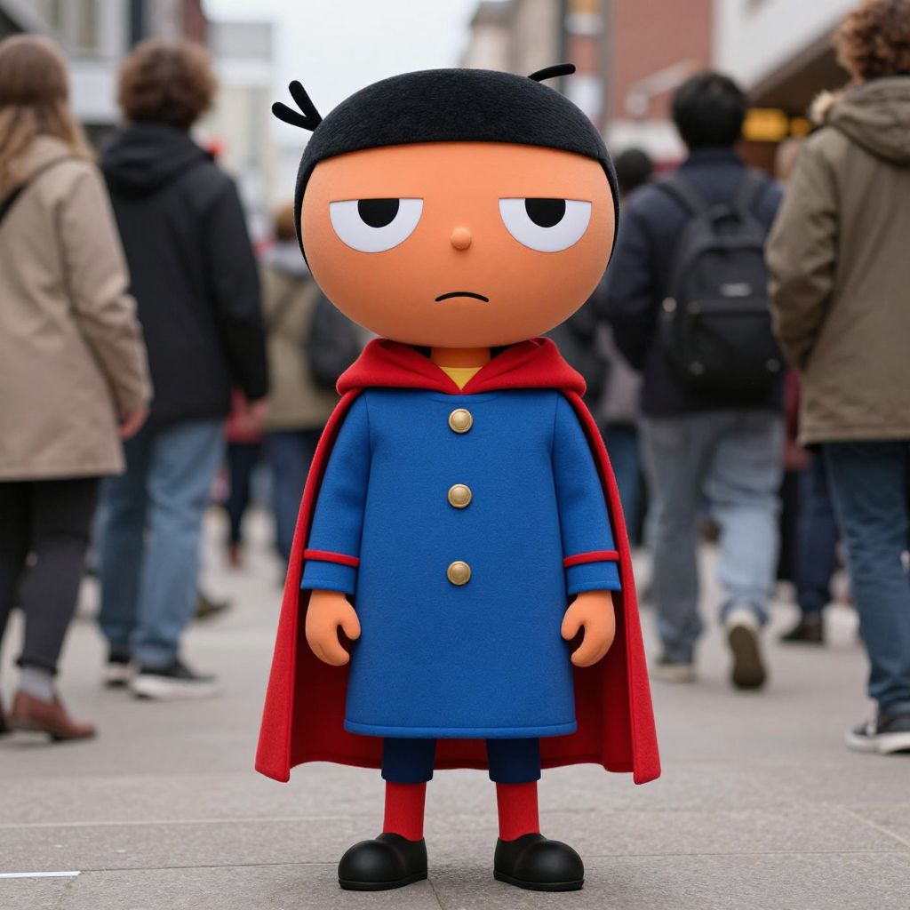 Photograph of a cartoonish, sad-faced character in a blue coat with red buttons, red cape, and black hat, standing in a busy city