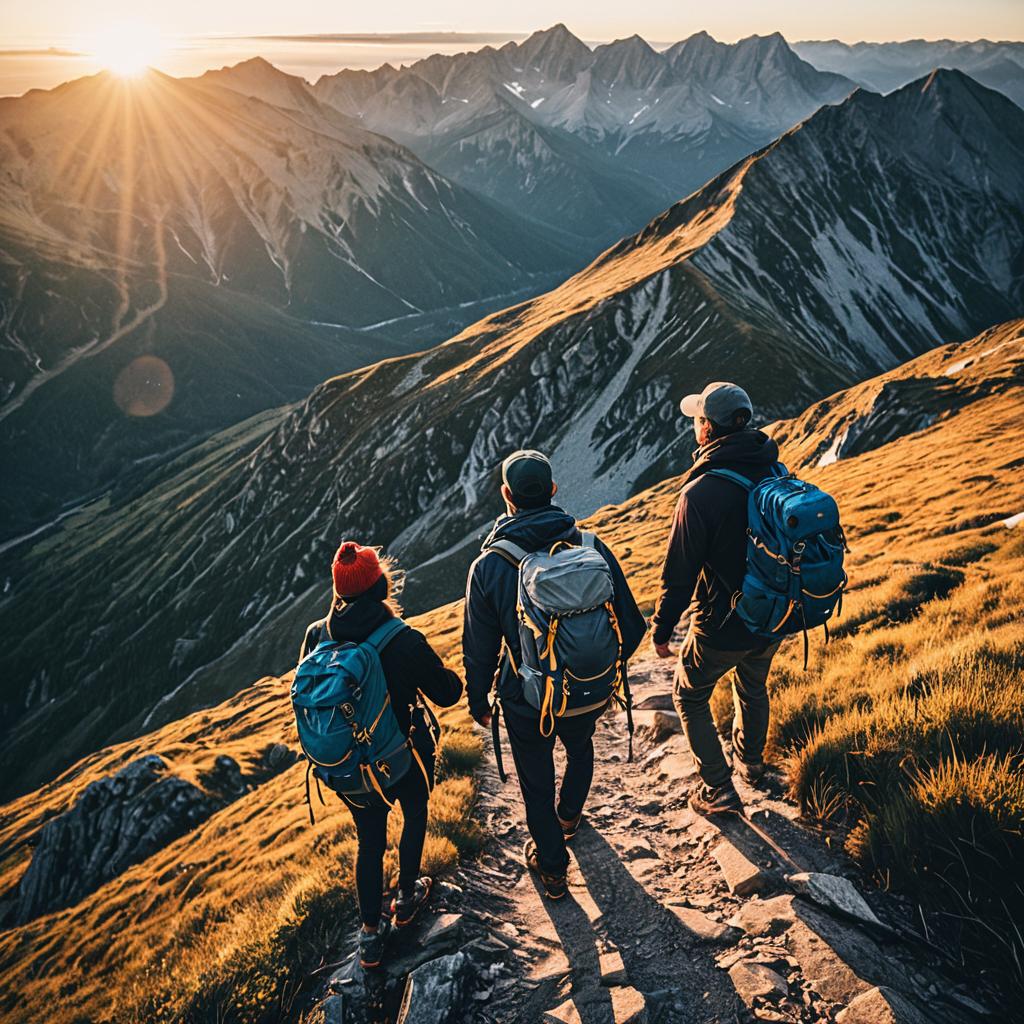 Photographs of hikers with backpacks, mountaintop at sunrise, bird's-eye view, wide-angle shot, PBR, HDR, hyperrealistic, post-photography aesthetic, 16K resolution, intricate details.