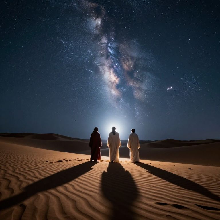 Three robed figures stand in a vast desert under a starry night sky, their silhouettes illuminated by a radiant celestial light that pierces through the Milky Way above, casting intricate shadows on the rippling sand dunes beneath them.