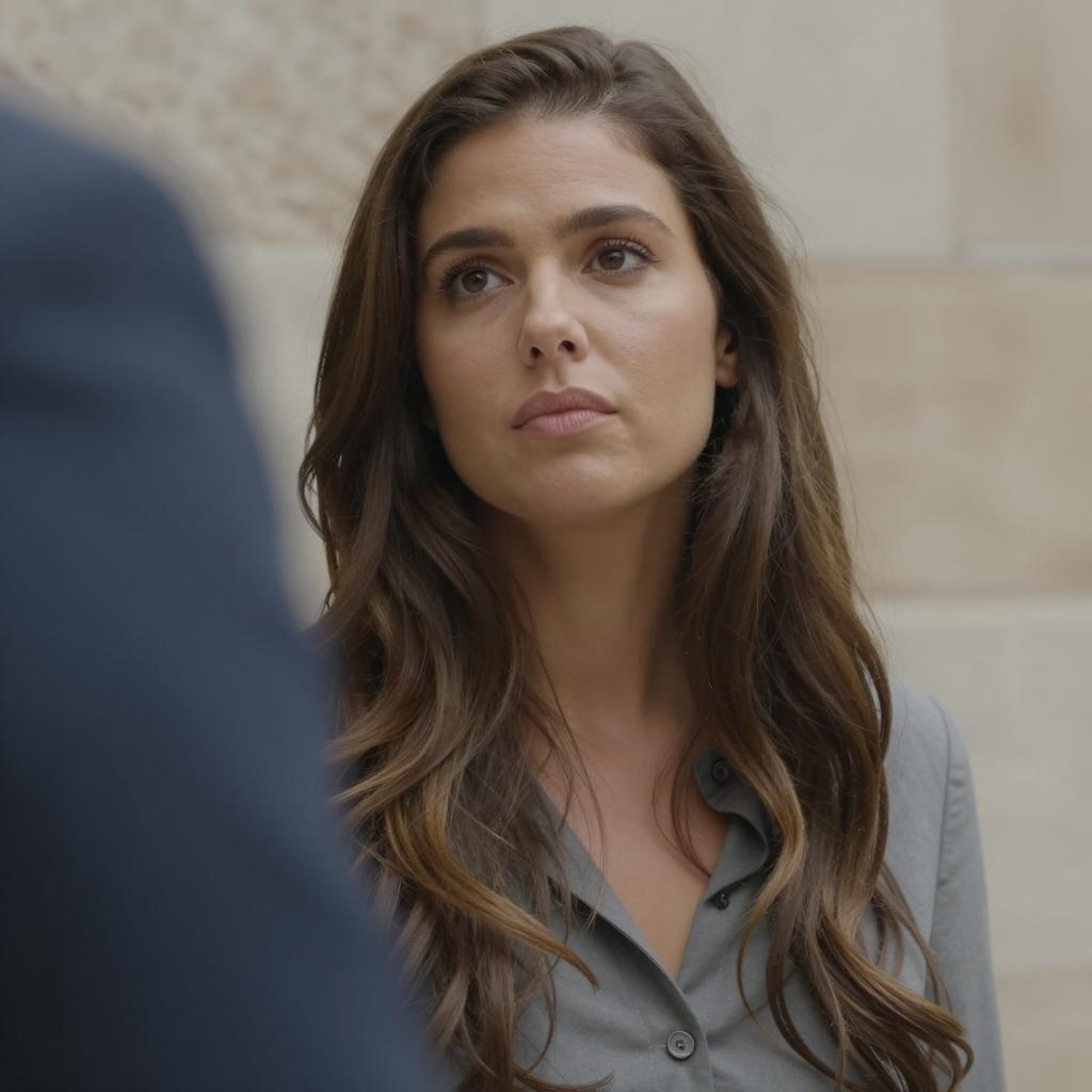 A woman with medium-length dark brown hair, light brown skin, and brown eyes. She wears an orange satin shirt. Her face shows a subtle, slightly amused smile. The background is blurred, with a wooden headboard partially visible on the left. She looks slightly to the right. One shoulder is slightly raised. The lighting is warm and dim.