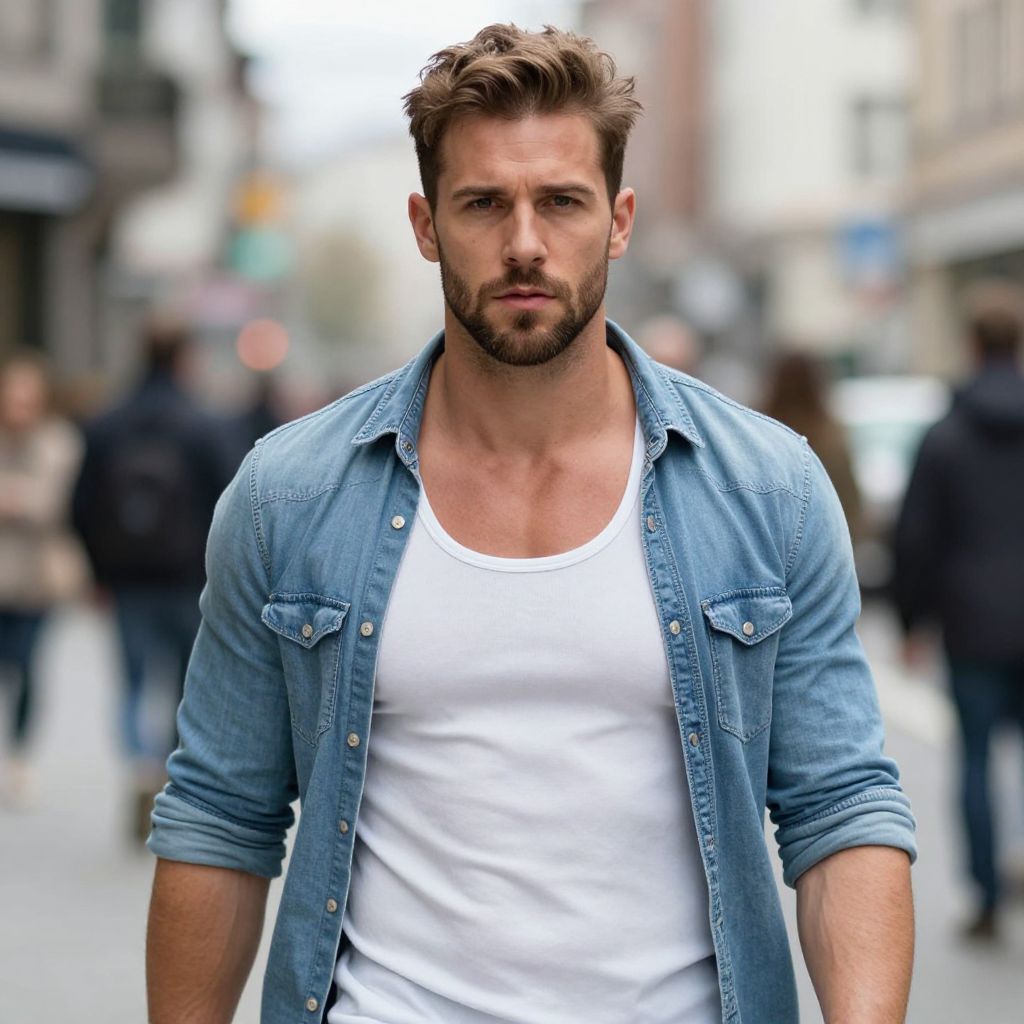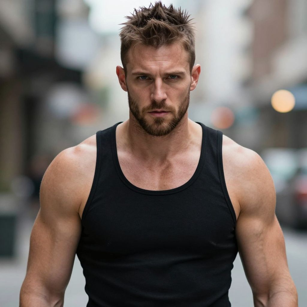 Photograph of a muscular, shirtless man with short, spiked brown hair and a trimmed beard standing in a golden desert at sunset. He has several tattoos, including a lion's head on his chest and a sun on his left shoulder. His intense gaze is directed at the camera. The sand dunes in the background are illuminated by the setting sun, creating a warm, orange glow.