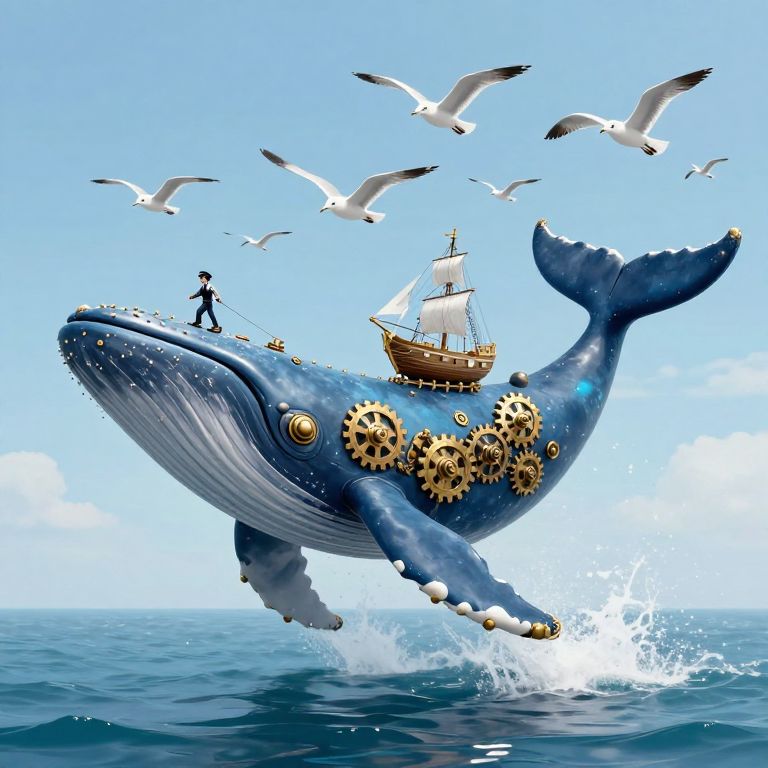 In a fantastical steampunk-inspired digital artwork, a majestic blue whale adorned with intricate mechanical gears and brass embellishments glides gracefully across a serene ocean, its tail propelling it forward as synchronized flocks of seagulls soar above, guided by a small sailor perched atop the whale's back, steering a miniature ship mounted on its dorsal fin.