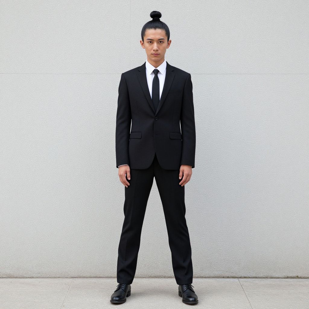 Photograph of a young Asian man with a topknot, wearing a black suit, white shirt, black tie, and black shoes, standing against