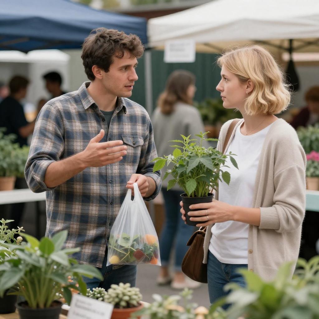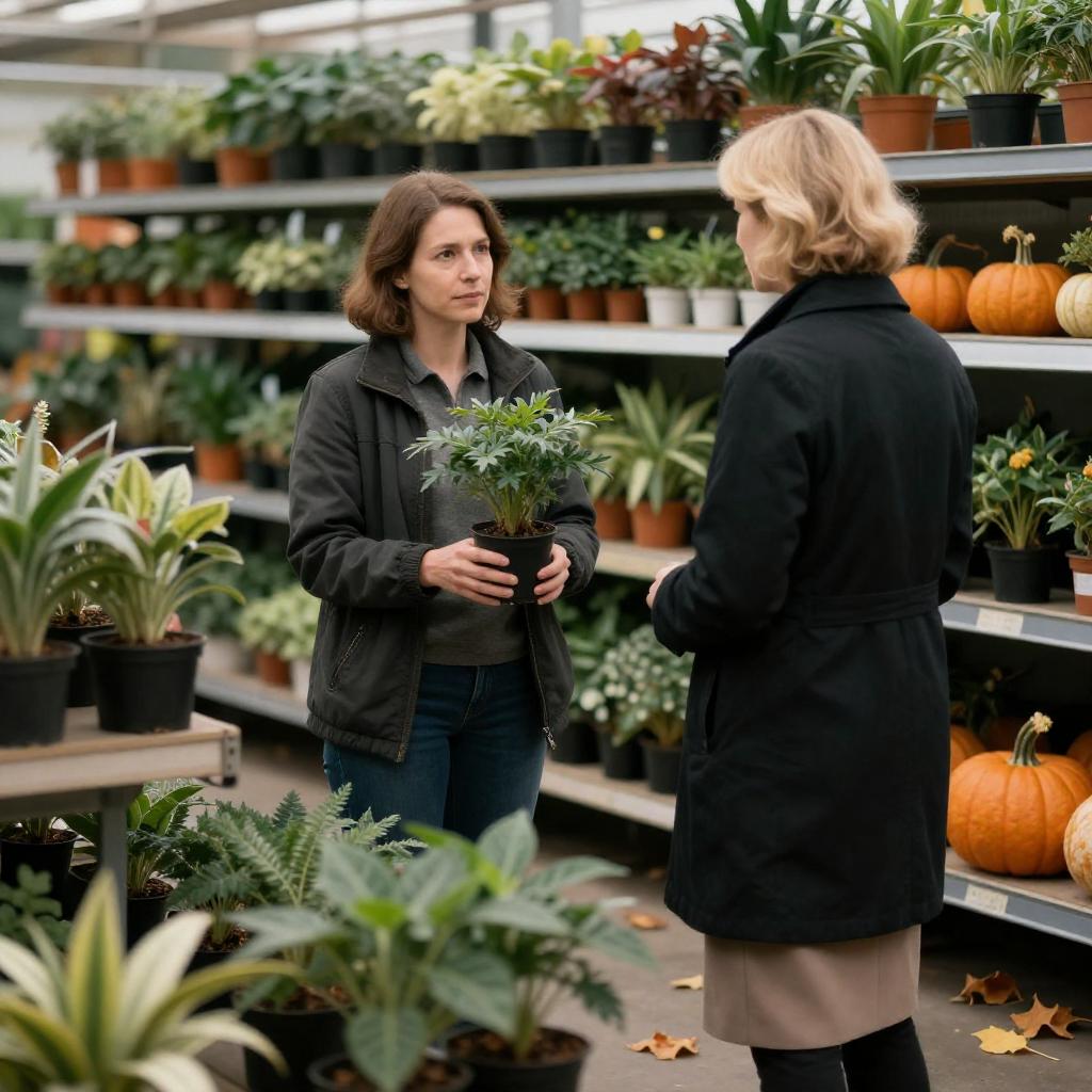 Two women engaged in conversation at a garden center, surrounded by shelves filled with various potted plants and pumpkins. One woman has short brown hair, wearing a dark jacket and jeans, holding a small potted plant. The other woman, with short blonde hair, is dressed in a black coat and beige skirt, facing away from the camera. Fallen autumn leaves are scattered on the ground.