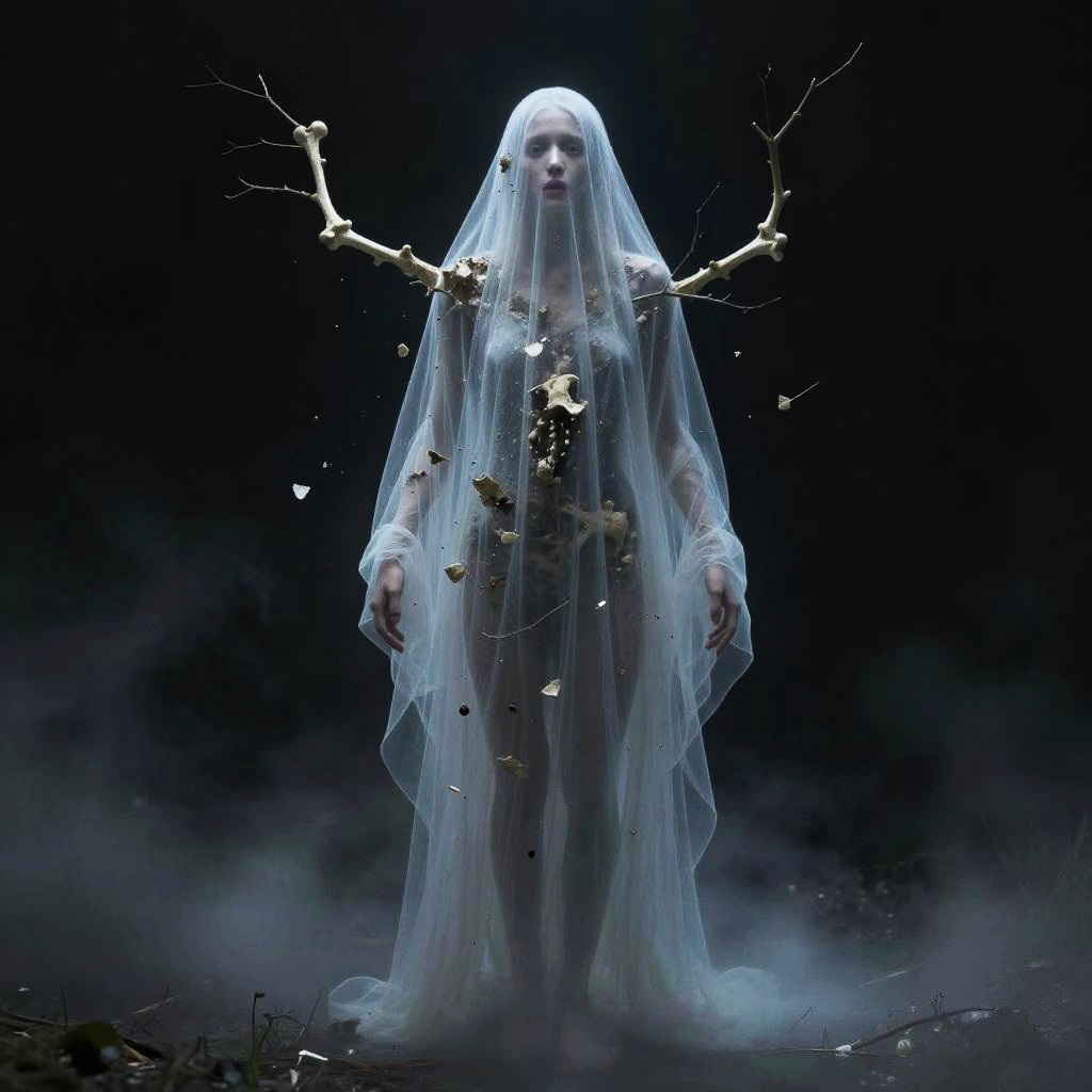 Full body, solo, ethereal specter with translucent skin and floating fragments of bone, branches reaching out, teeth baring, looking at viewer, gently hovering over mist-covered ground, haunting serenity with a hint of sorrow, black background