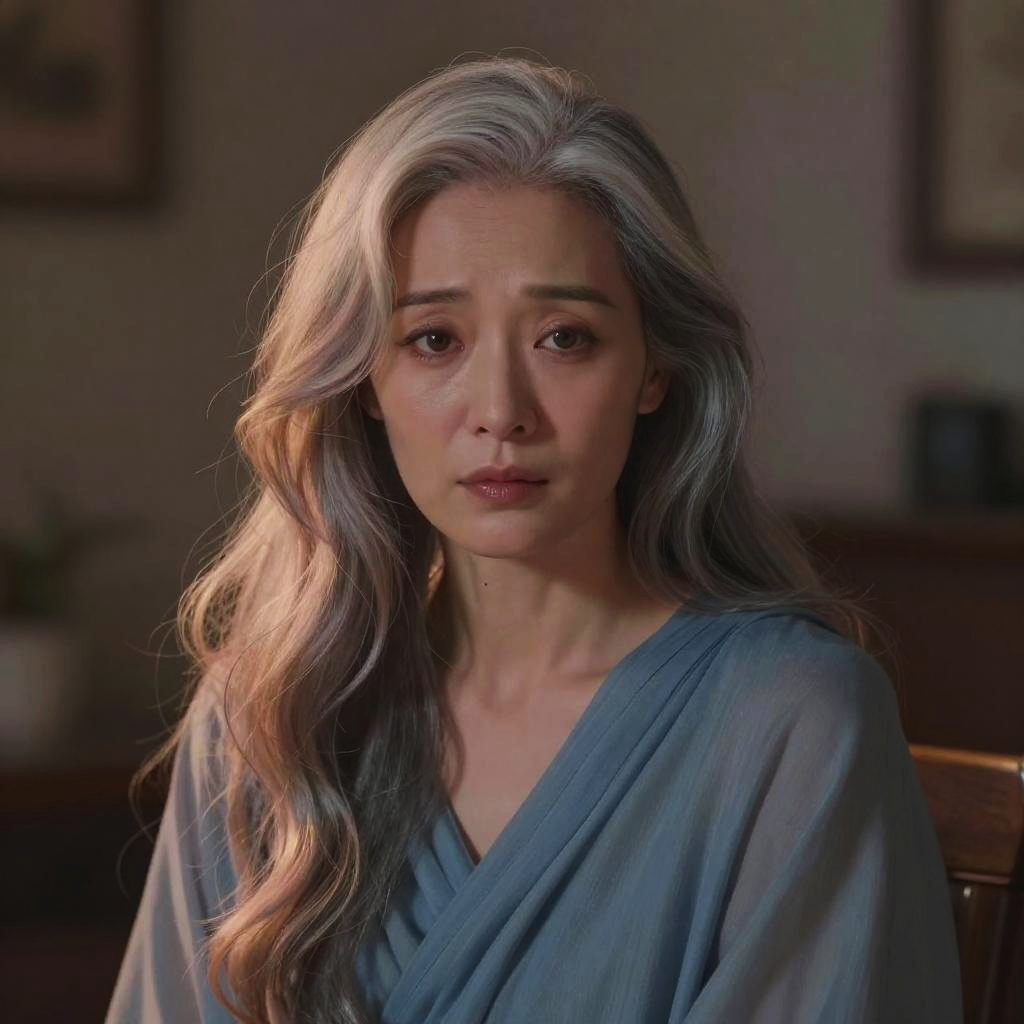 Soft anime‑style digital painting of a beautiful young woman in her late forties with long flowing salt-and-pepper with warm rose-gold highlights hair and expressive eyes, wearing a draped smoky sapphire garment, gently illuminated by diffused light in a muted, enclosed setting, her gaze direct and emotional, detailed facial features and soft textures with pastel highlights, conveying a mood of quiet vulnerability and intimacy