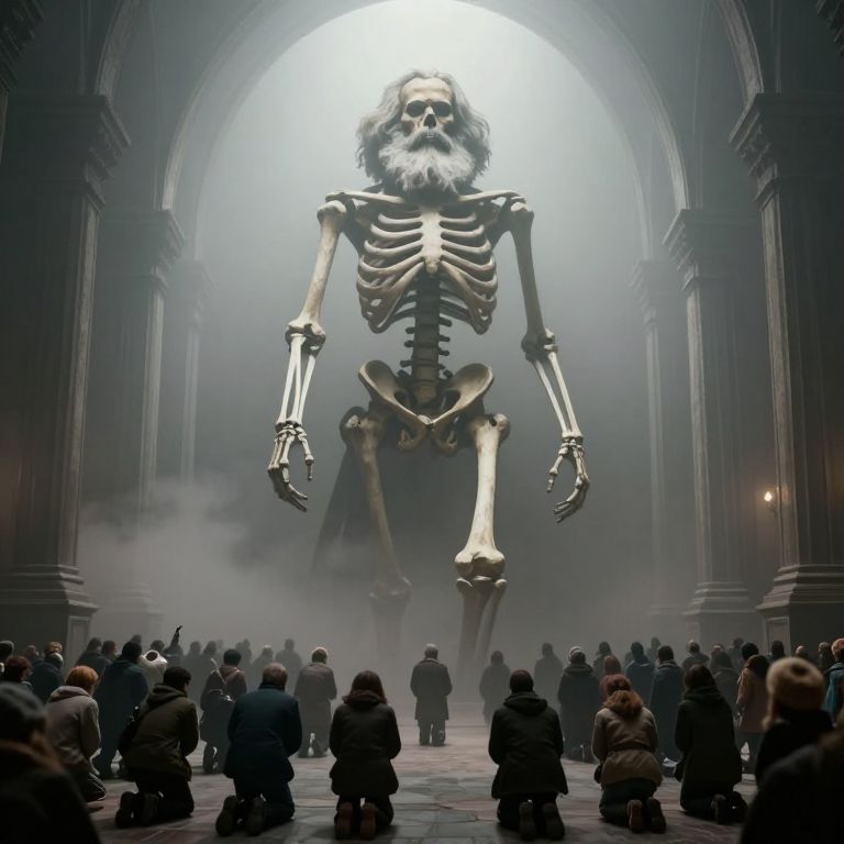 In a misty, atmospheric setting, a colossal skeletal figure, reminiscent of Karl Marx, stands imposingly in the center of a vast, arched corridor. The figure's beard and hair are long and unkempt, adding to its imposing presence. The corridor is filled with a dense crowd of tiny people, dressed in winter clothing, who kneel and bow in reverence or awe. The fog creates a sense of depth and mystery, obscuring the background and giving the scene an ethereal quality. The interplay of light and shadow accentuates the skeletal figure's form, making it the focal point of the composition. The overall arrangement of the scene suggests a powerful, almost divine figure being worshiped by the crowd, creating a striking contrast between the grandeur of the figure and the humility of the people.