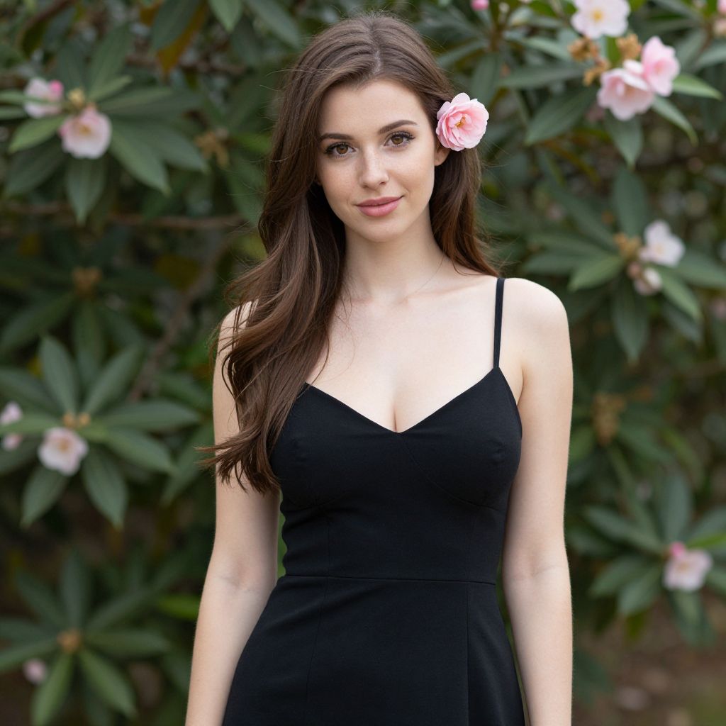 Photograph of a young Caucasian woman with fair skin and long, dark brown hair, wearing a black, sleeveless, V-neck dress with thin straps. She has a pink rose flower clipped in her hair on the left side. Her expression is calm and she is looking directly at the camera. The background features lush green foliage with pink and white flowers, slightly blurred to keep focus on her. The lighting is natural, highlighting her clear complexion and subtle makeup. The overall mood is serene and elegant.