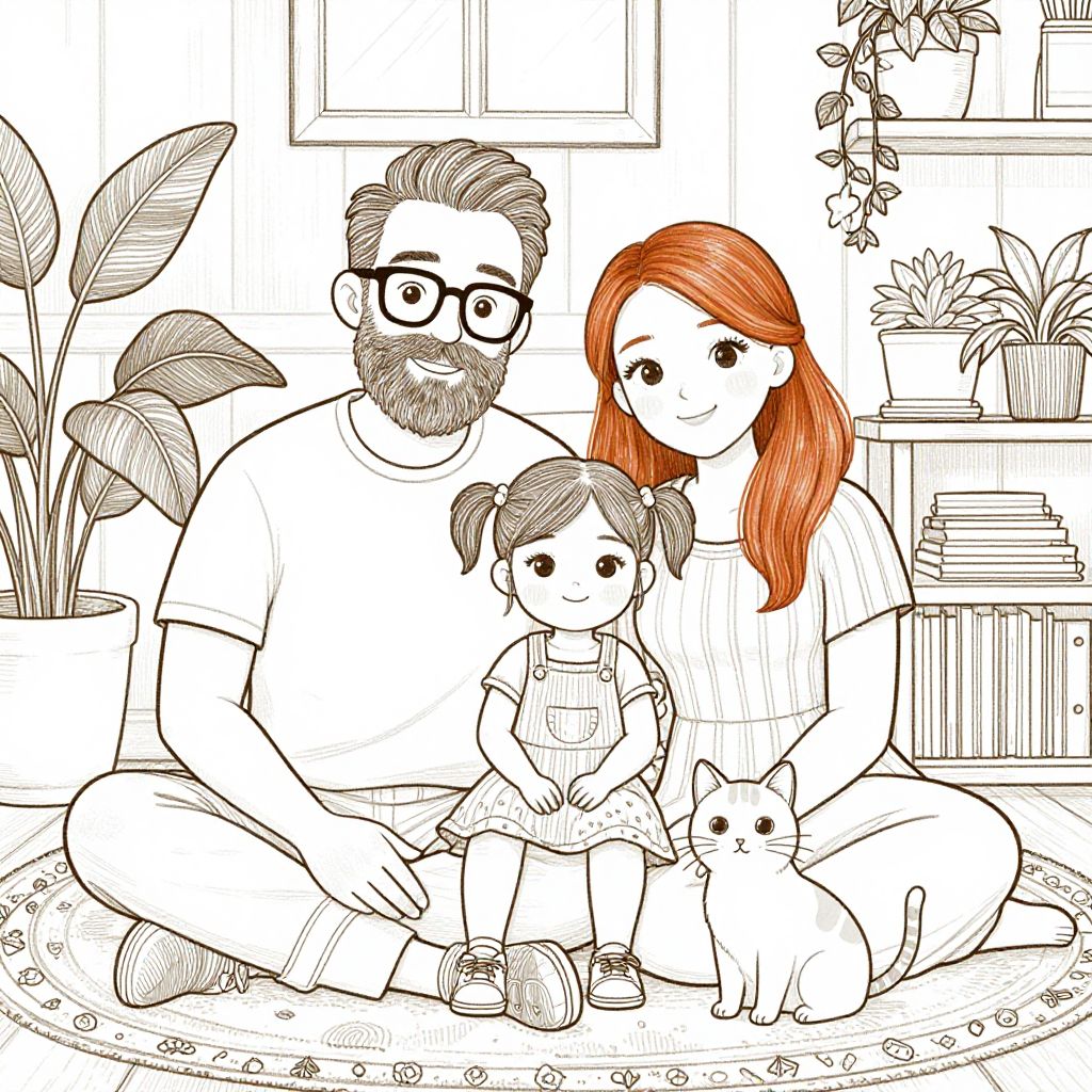 A detailed, color line art illustration of a small family, featuring a man with a beard and glasses, a woman with red hair, a young girl with pigtails, and a cat, set in a cozy, plant-filled room.