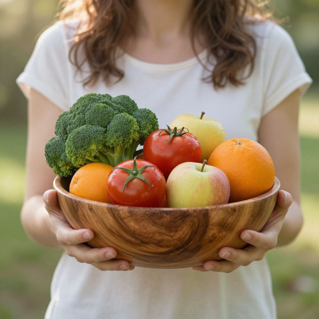 Woman holding a wooden bowl filled with vibrant organic fruits and vegetables, including broccoli, tomatoes, apples, and oranges, set against a serene outdoor backdrop with sunlight filtering through trees.