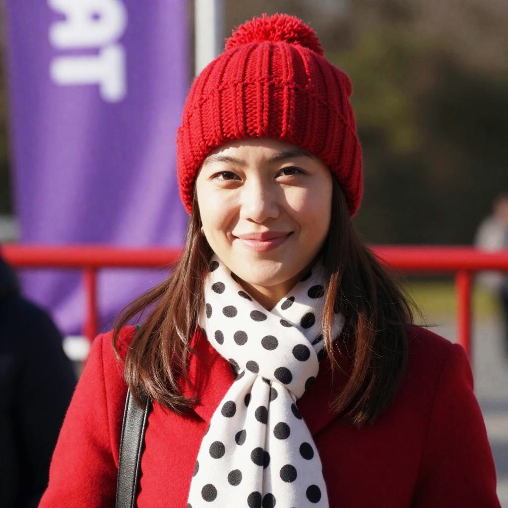 Woman in photograph wearing bright red knitted hat, matching coat, and polka dot scarf, smiling. Background includes purple banner, red railing, and blurred greenery. Sunlight illuminates her face and outfit. She has long brown hair, fair skin.