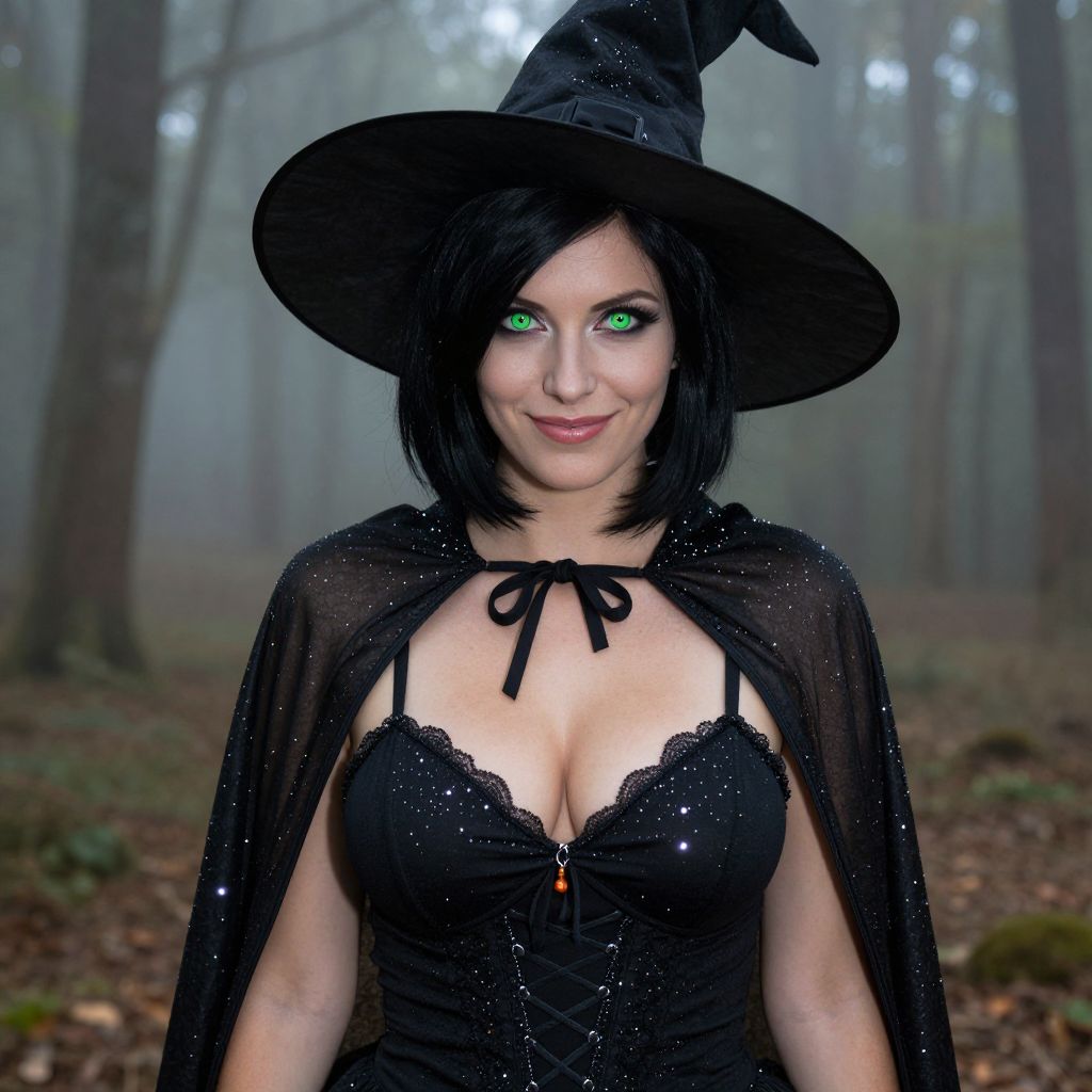 A confident woman with a black short hairstyle and a glamorous Halloween costume stands in a foggy forest clearing, dressed in a witch outfit with a black cloak and glowing sparkles, her face partially hidden by a wide-brimmed hat with a sly smile and bright green eyes.. The woman has big breasts and cute face