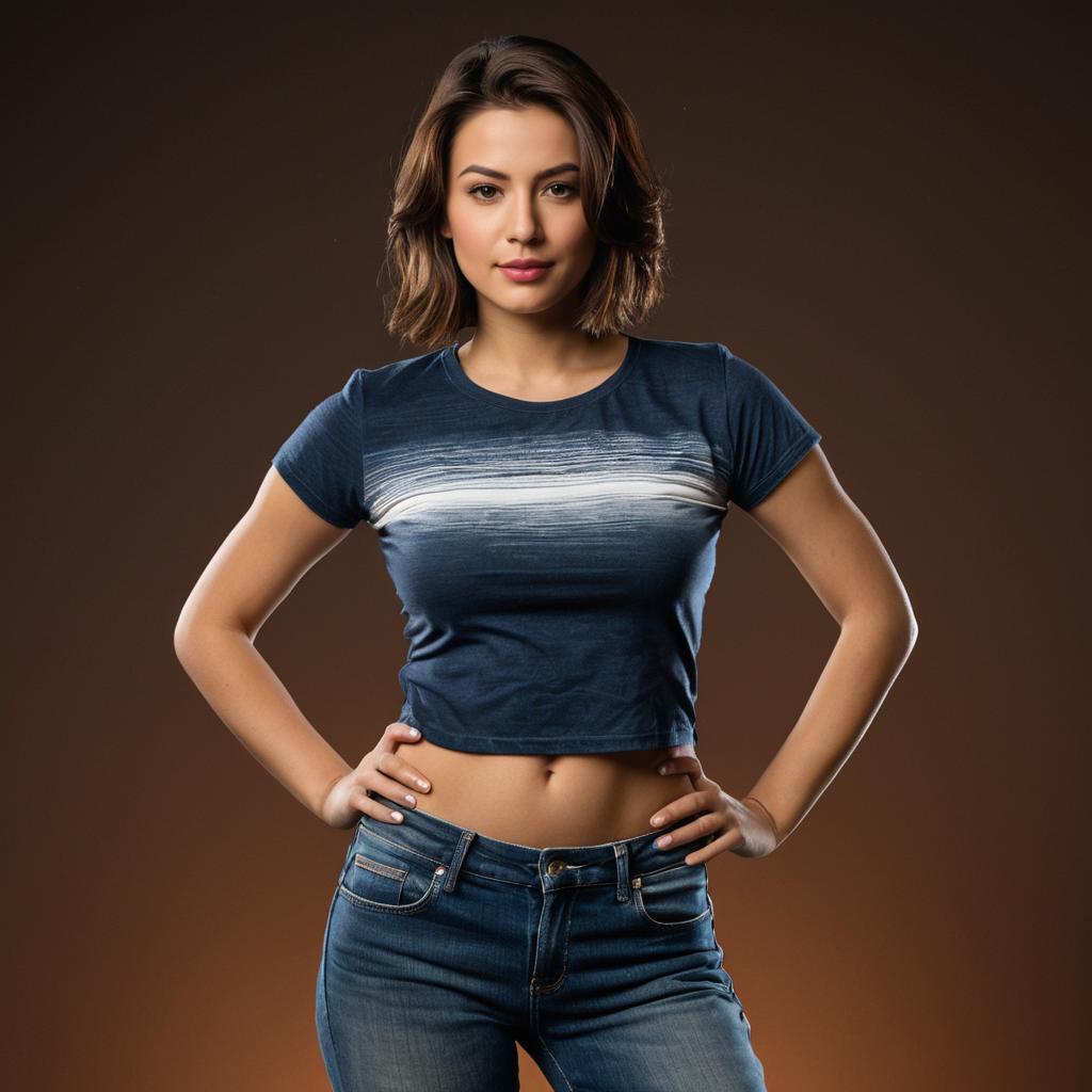 Ombre dance,1girl, solo, realistic, shirt, brown hair, short hair, pants, arms at sides, jeans, denim, short sleeves, brown eyes, lips, brown background, nose, cowboy shot, looking at viewer, photorealistic, breasts, simple background, t-shirt