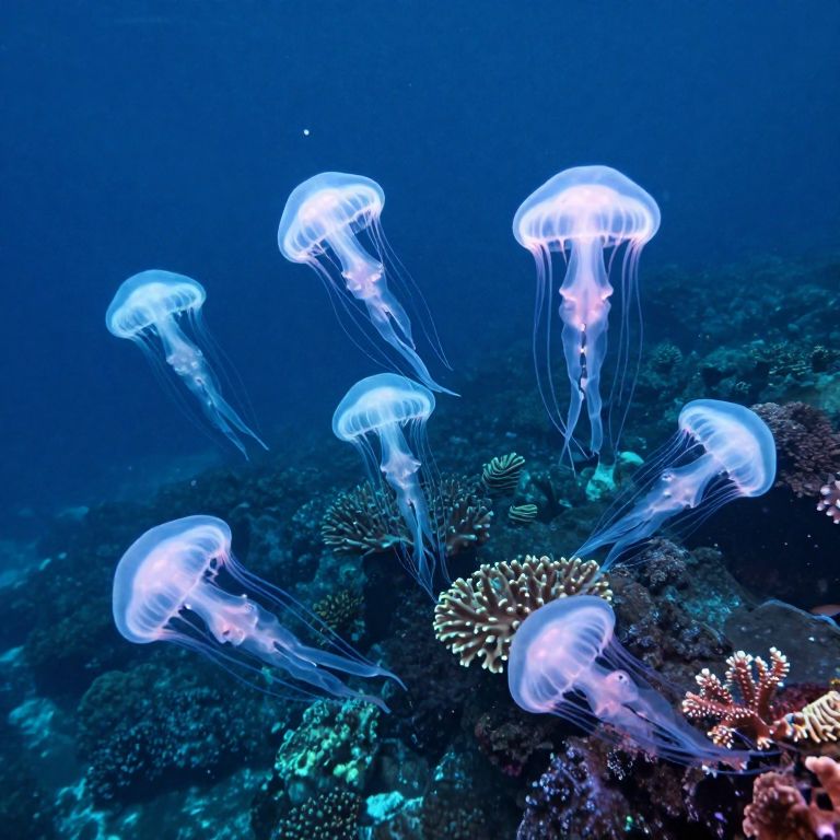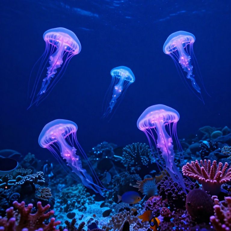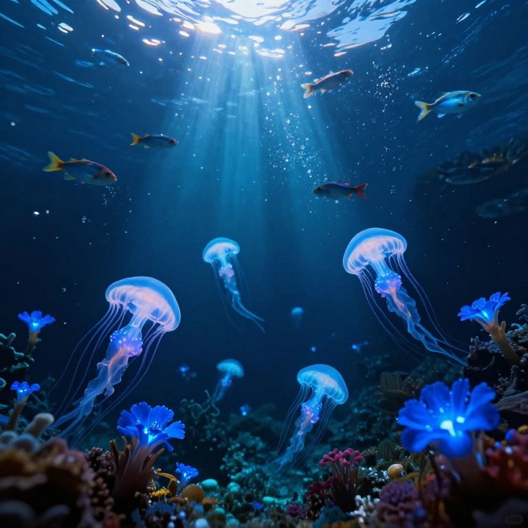 Visualize an awe-inspiring underwater vista reminiscent of James Cameron's cinematic masterpiece, where luminous jellyfish drift gracefully through the abyssal depths like celestial orbs adrift in an ethereal oceanic realm. These bioluminescent beings emit a mesmerizing palette of blues and purples that emanate from their translucent forms, casting captivating shadows on the vibrant coral reefs teeming with exotic marine life. As if captured from an enigmatic 'shark's-eye perspective', this enchanting scene unveils the resplendent creatures in all their radiant splendor, evoking a harmonious blend of wonder and otherworldly intrigue.