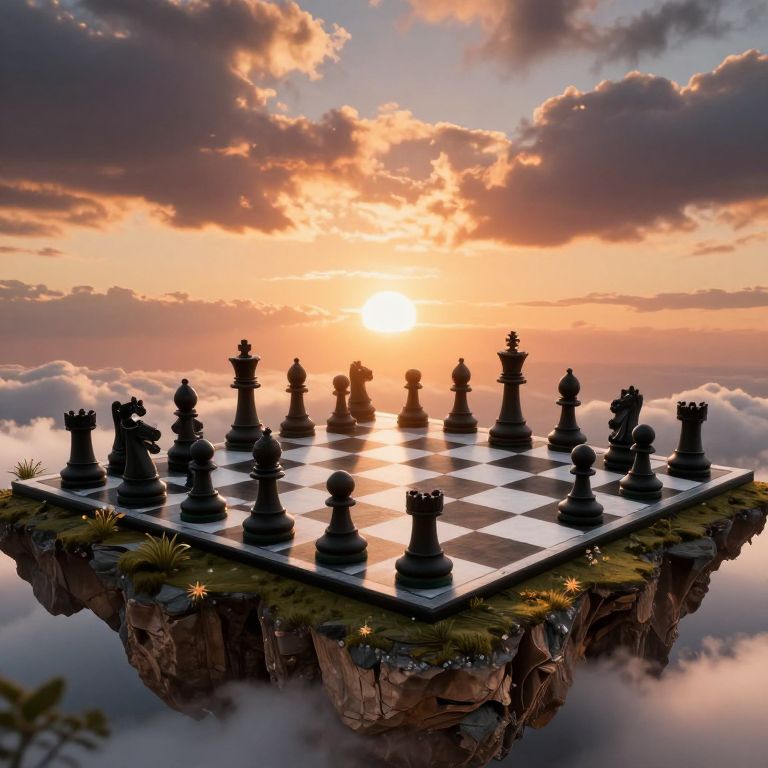 A digital artwork depicts a surreal chessboard suspended in mid-air against a vibrant sunset sky with orange and pink clouds. The chessboard, with black and white pieces, sits on a rocky cliff surrounded by fluffy clouds. The sun is partially obscured by clouds, casting a warm glow over the scene. The chess pieces are silhouetted, creating a dramatic contrast against the colorful sky. Grass and small plants grow at the base of the cliff, adding a touch of nature to the ethereal setting. The overall composition is dreamlike and fantastical.